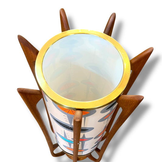 Mid-Century Modern Floor Lamp — Teak & Brass Tripod Base with Retro Atomic Geometric Shade