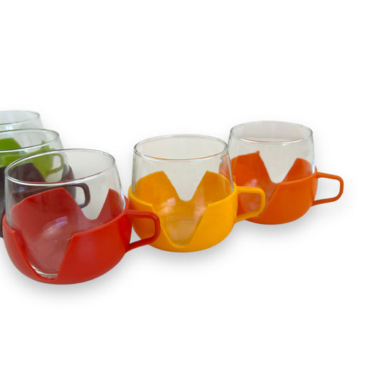 Dutch Glass Cups with Bright Colour Plastic Holders - Made in Holland - 5 Colourful Retro Mugs