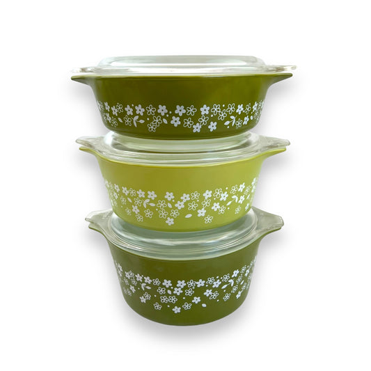 Pyrex Spring Blossom Green Casserole Dish Set of 3 with Lids - Made in USA - 1970s Retro Cookware