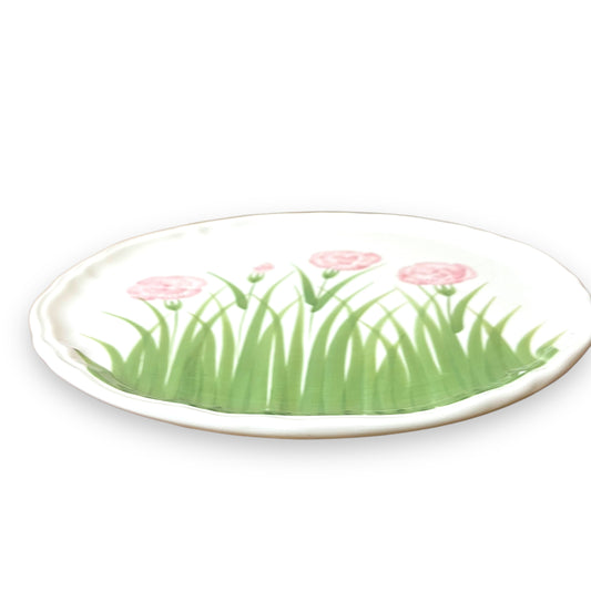 Hand-Painted Italian Ceramic Plate – Pink Carnations & Grass Design, Made in Italy