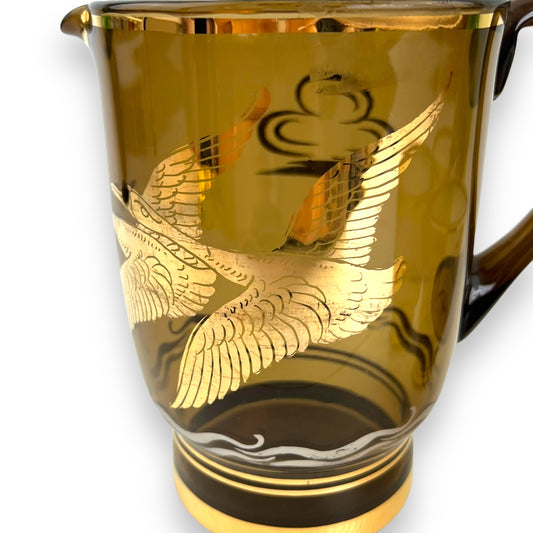 Smokey Black Glass Jug with gold flying birds and 3 glasses