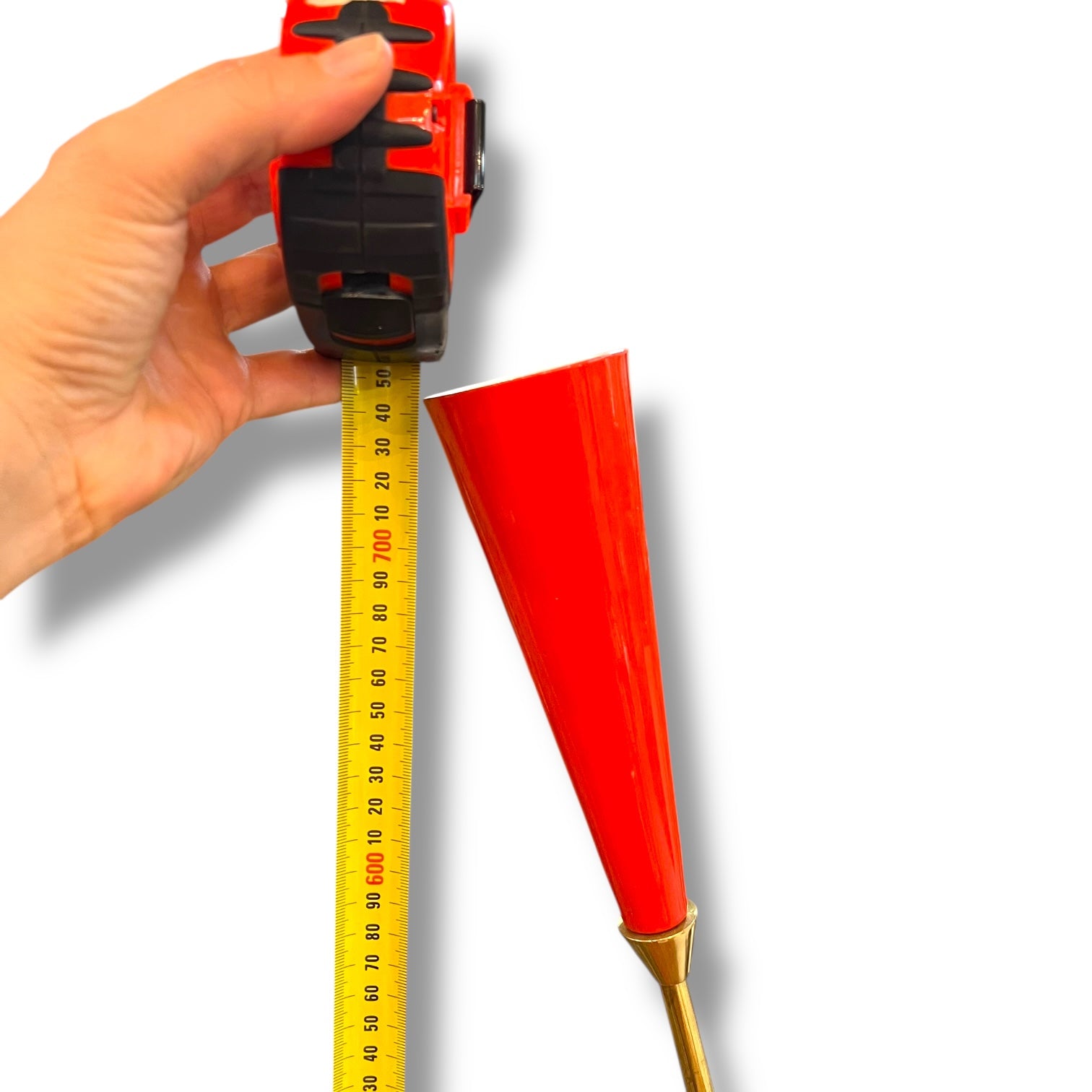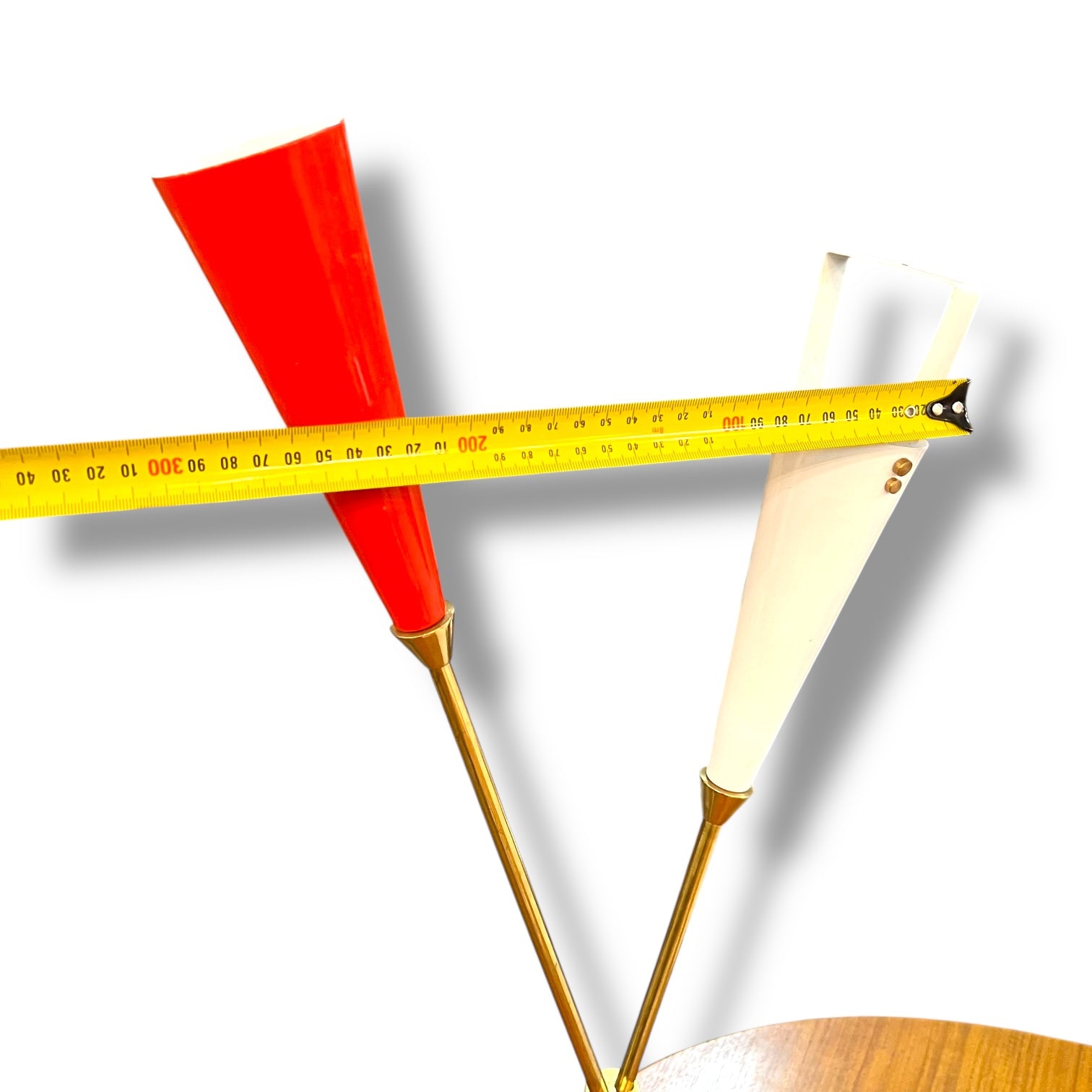 Striking mid-century modern Italian-style floor lamp featuring dual conical “Diabolo” shades in red and white enamel mounted on adjustable brass stems with a heavy solid marble base.