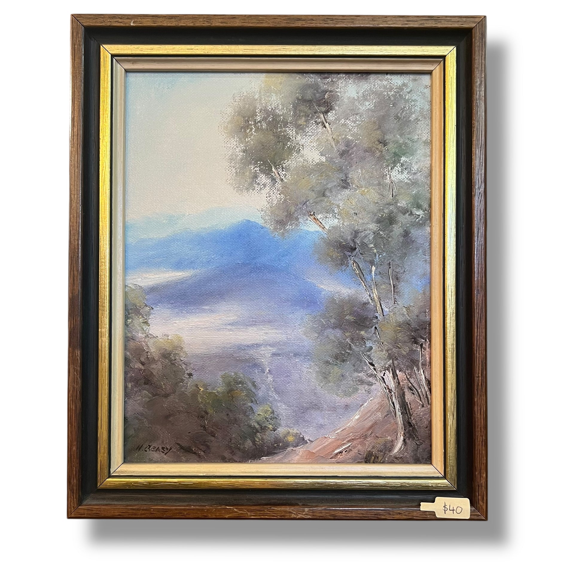 A classic nod to mid-century Australian landscape painting, this signed piece by M. Beasy captures a serene mountain view framed by eucalyptus trees in soft pastel hues. Painted in a traditional bush style popular throughout the 1960s–80s, it’s likely a reproduction or decorative artwork rather than a unique fine art piece — but still delivers that familiar nostalgic Australiana charm.