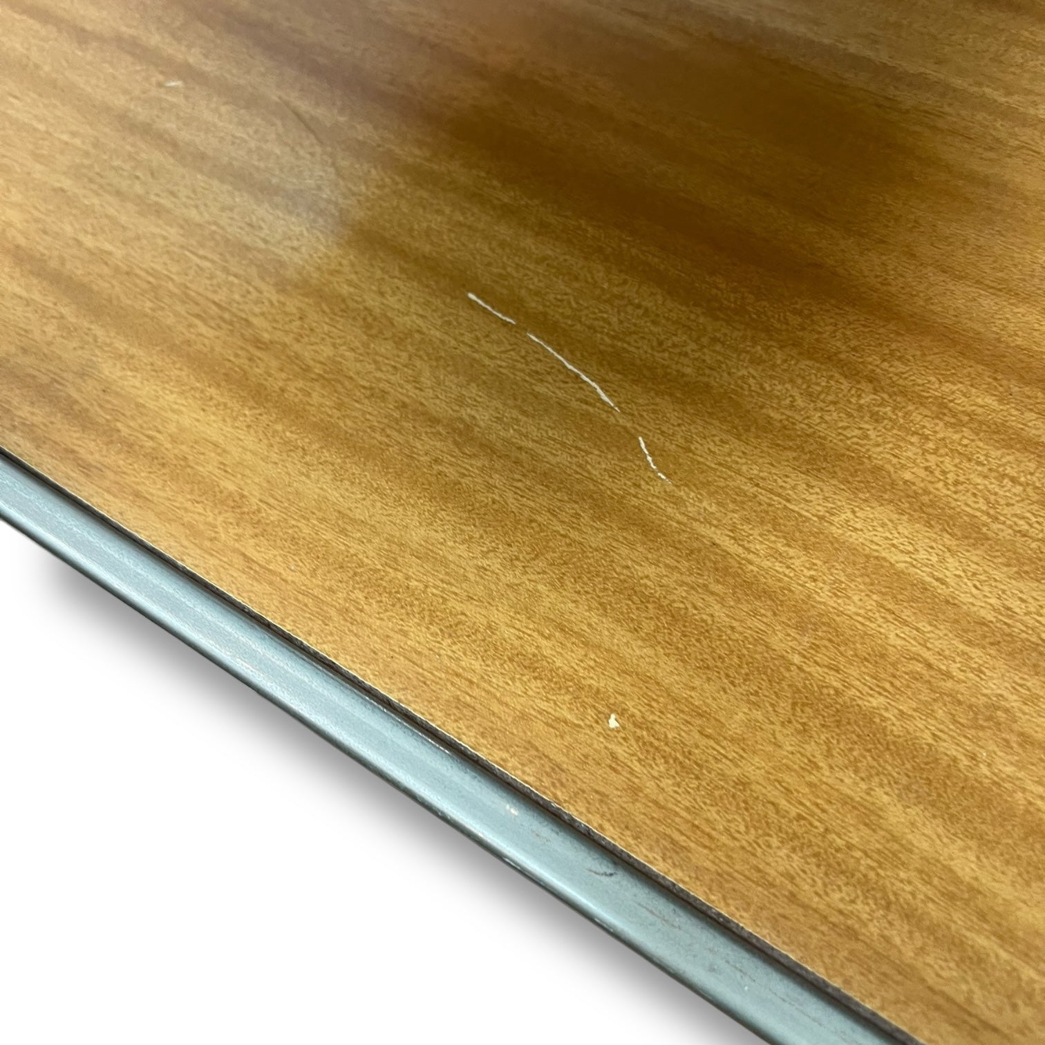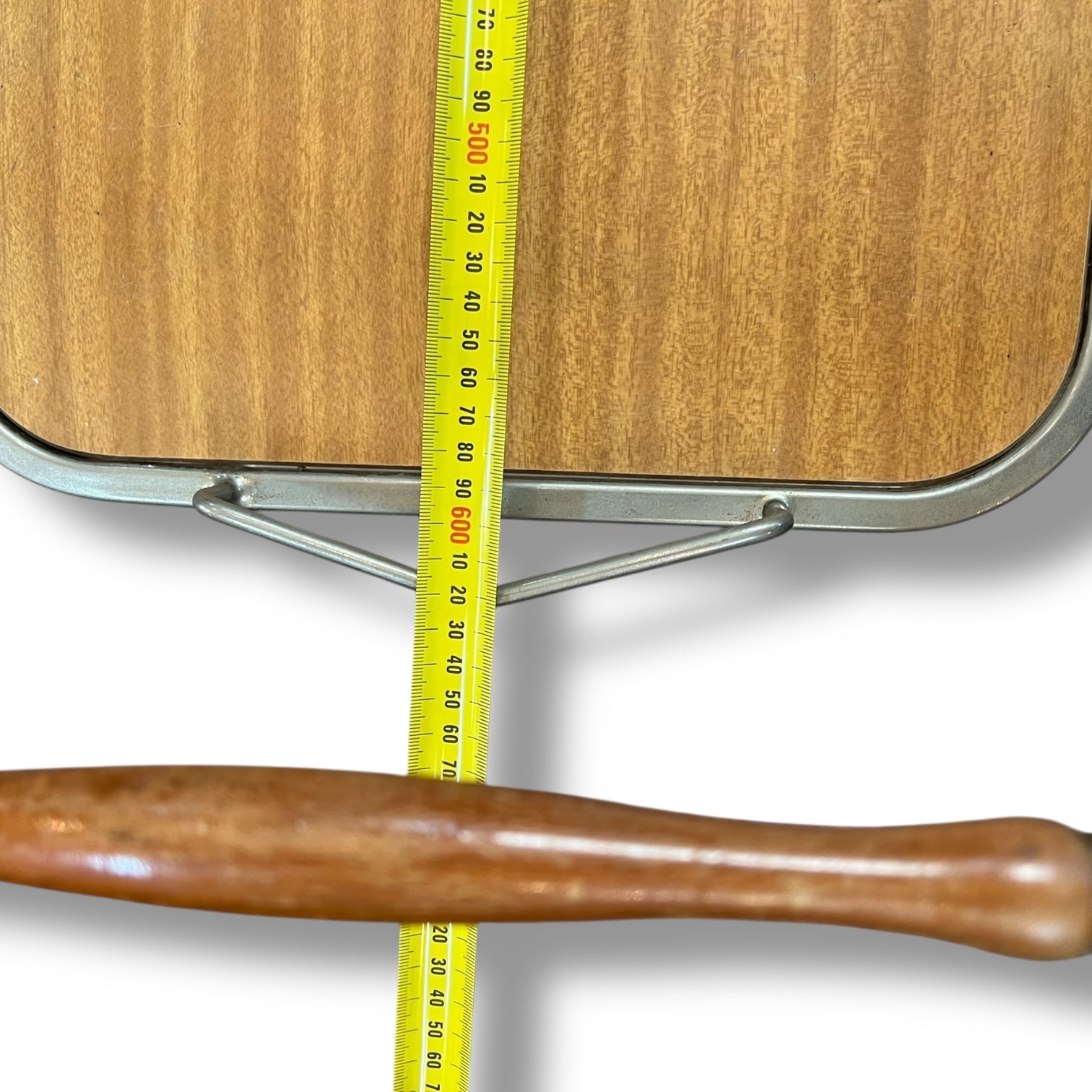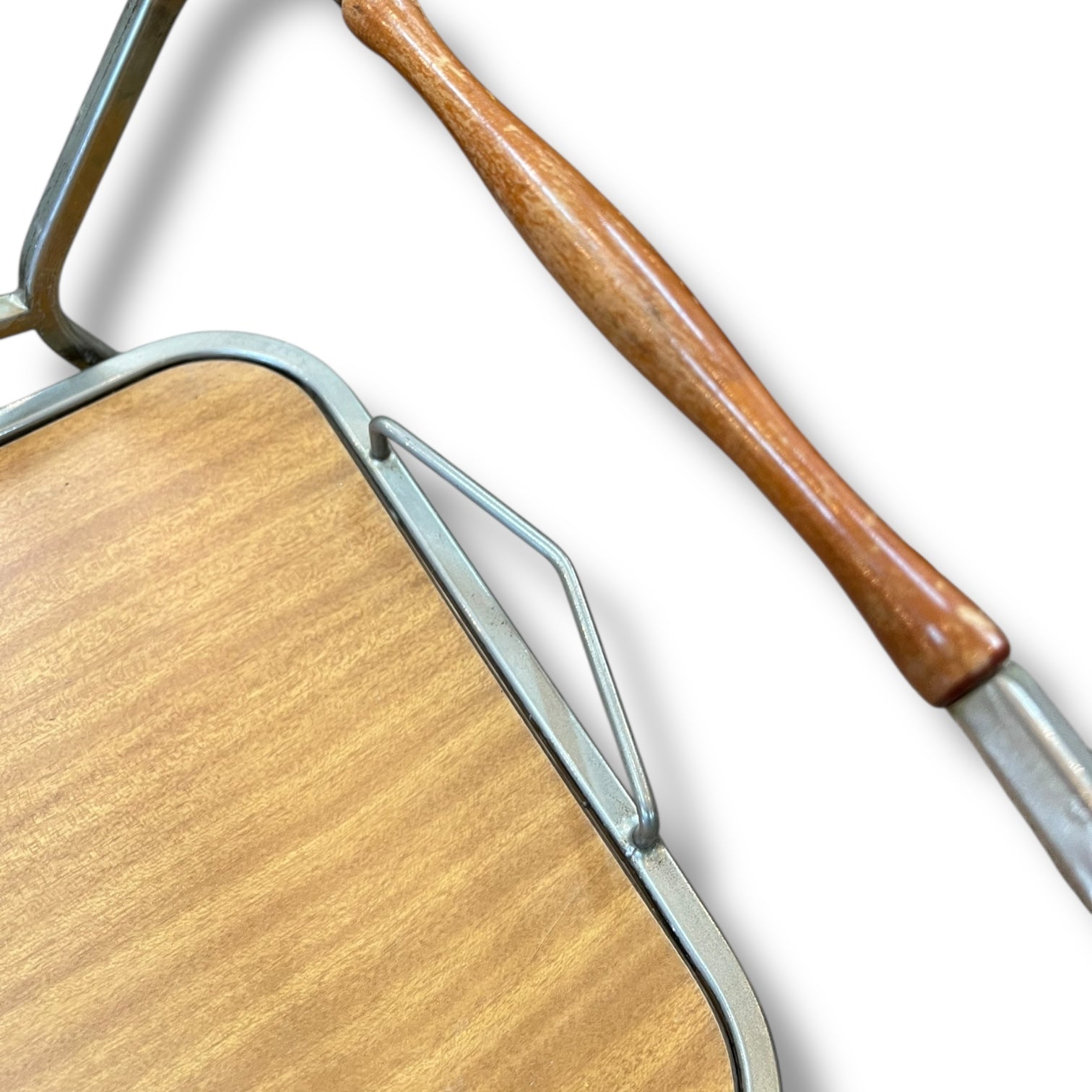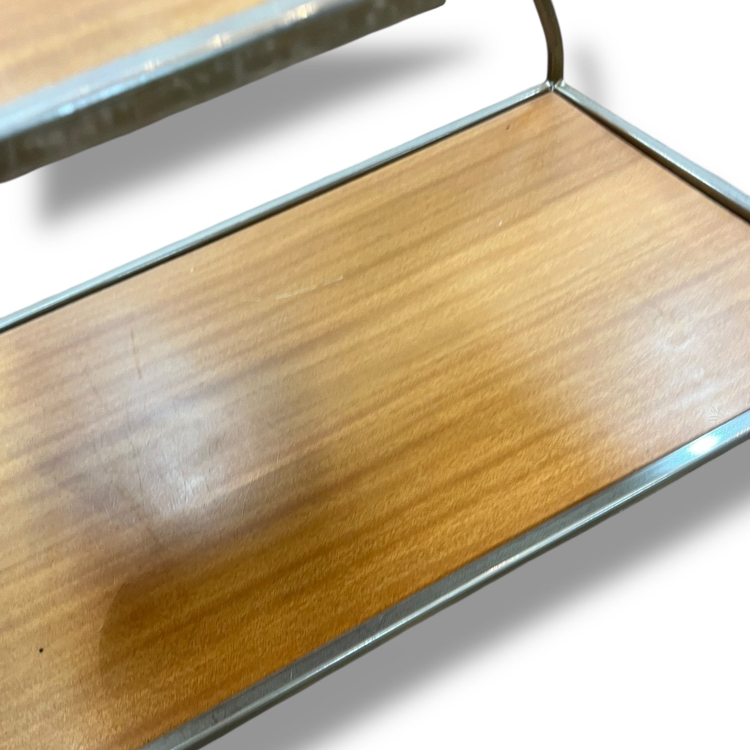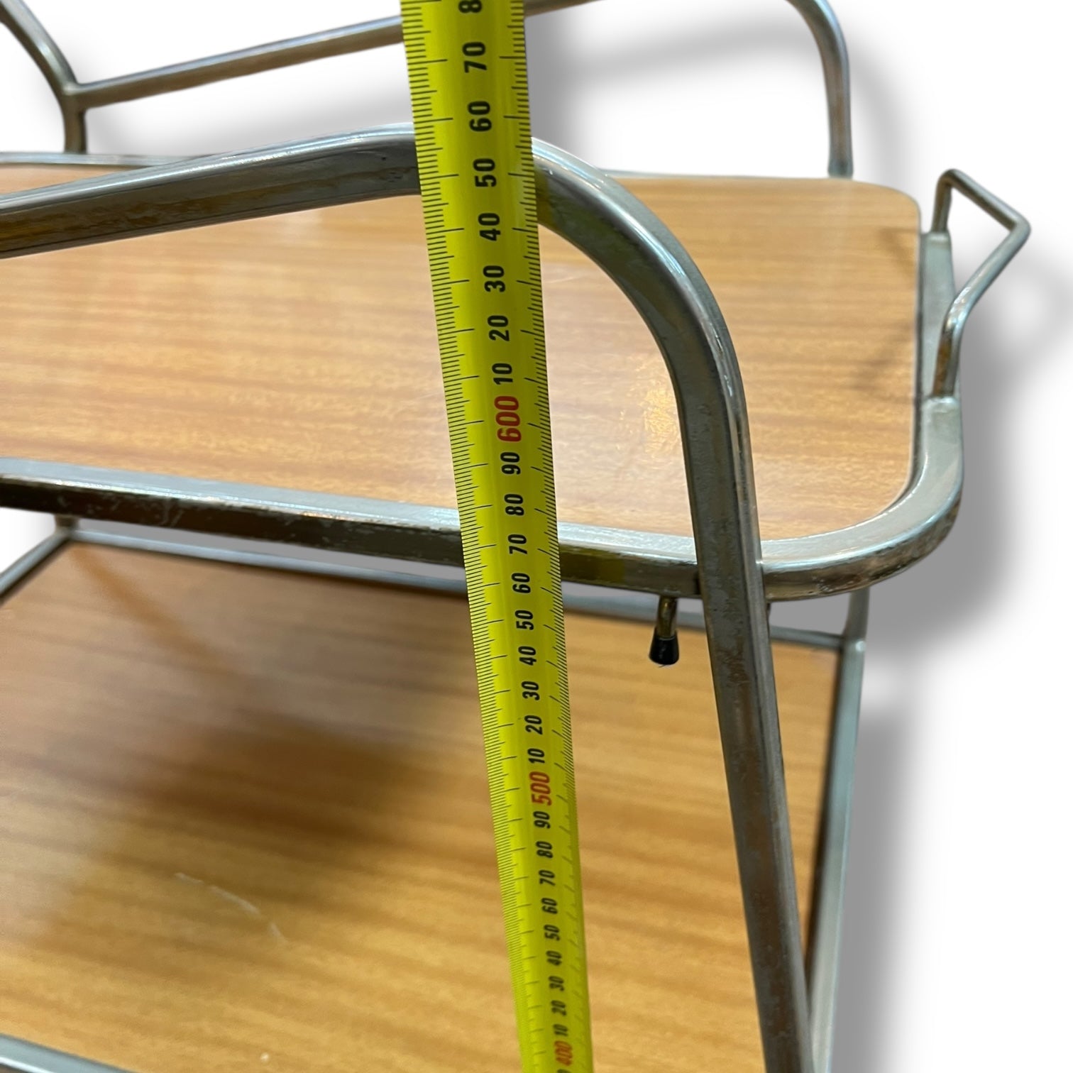 The top tray lifts off easily, letting you carry drinks and snacks directly to your guests. It has a comfortable timber-look handle detail and rolls smoothly on its original castor wheels. There’s a small scratch on the lower shelf, consistent with age and use.