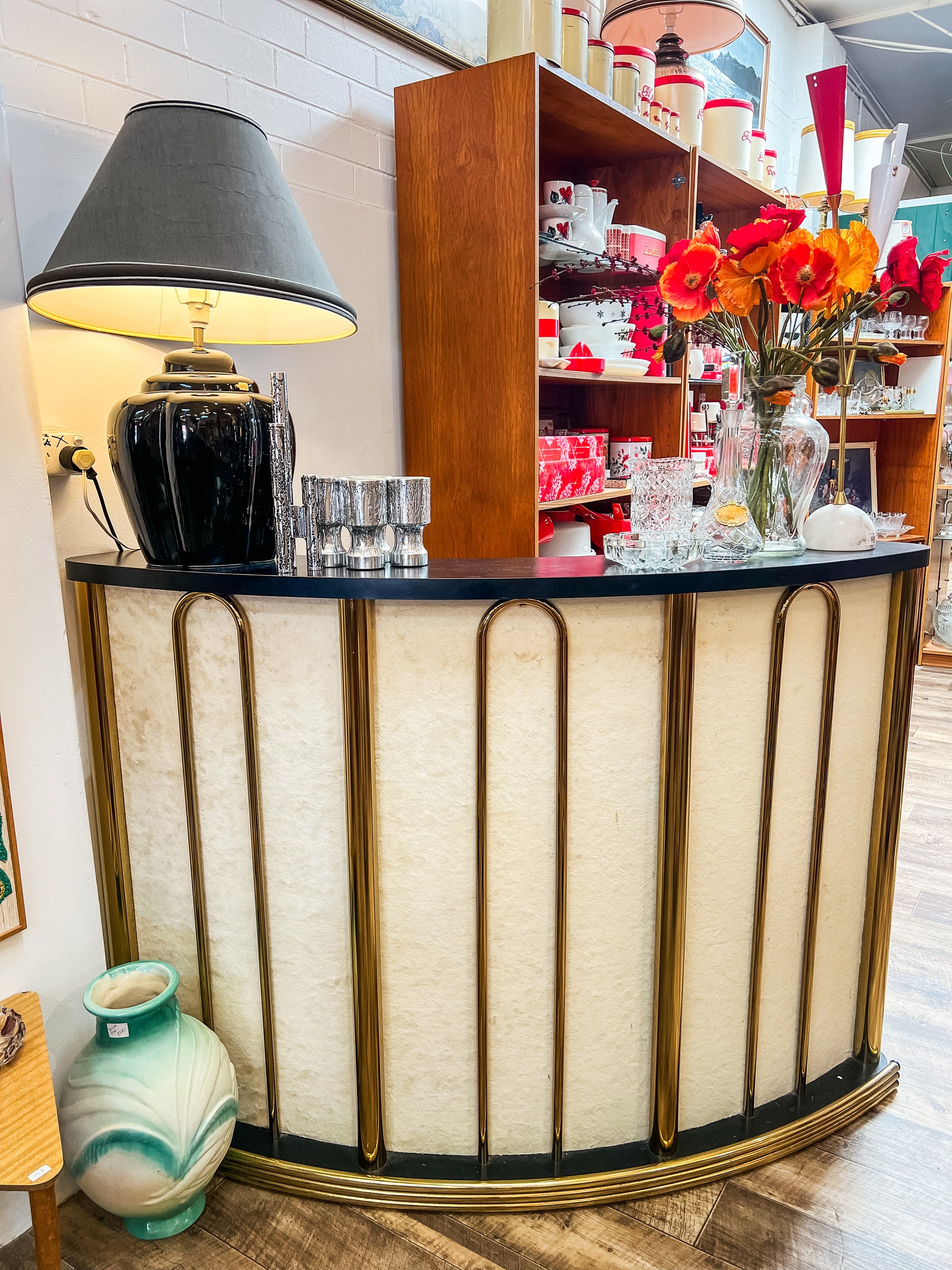 A striking vintage curved bar or console cabinet featuring polished brass vertical detailing, a sculptural semi-circular form and black laminate shelving. Designed to make a statement, this piece blends classic late-mid-century glamour with practical storage.