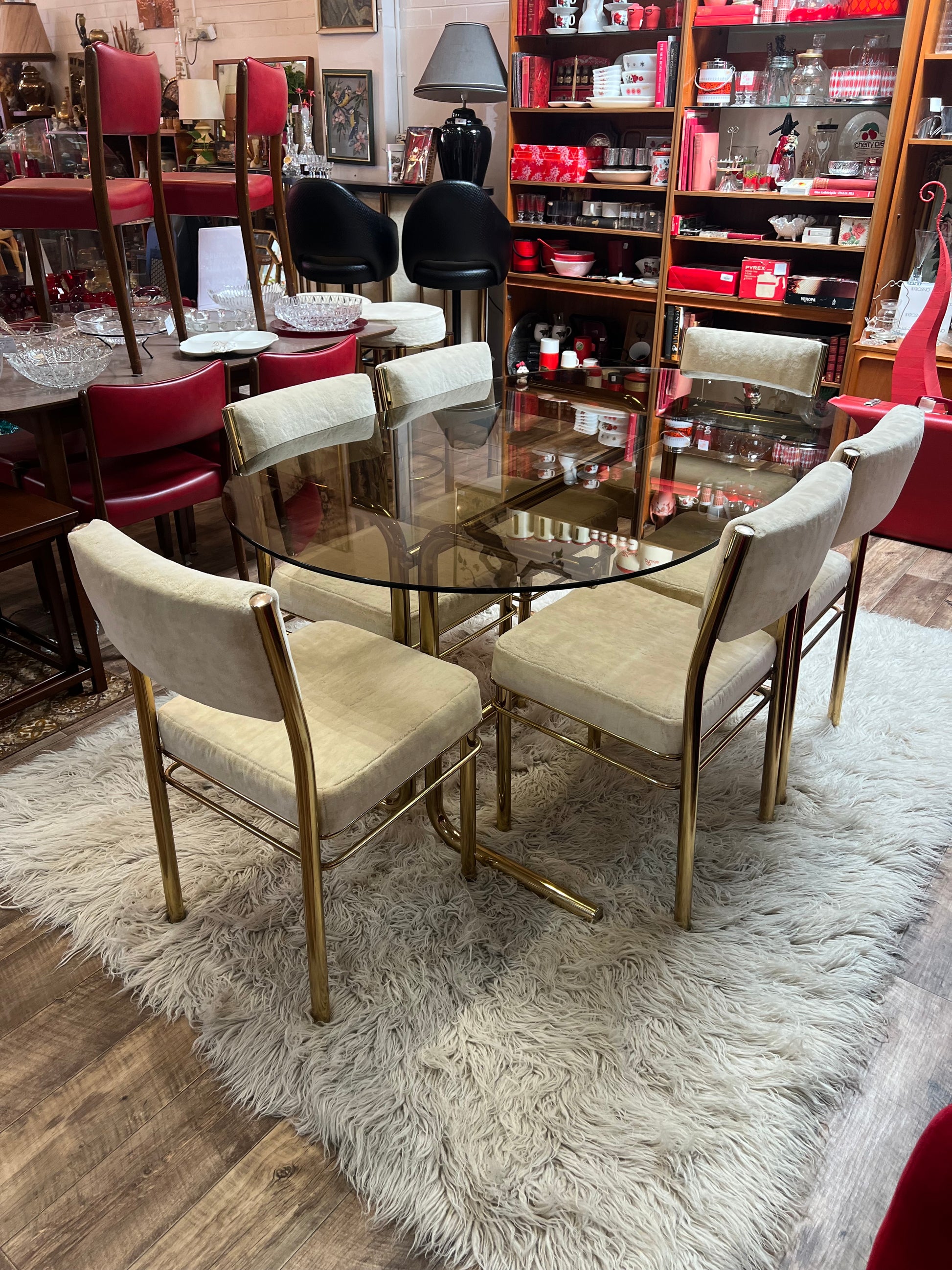 Brass & Smoked Glass Dining Table with 6 Chairs cream upholstery