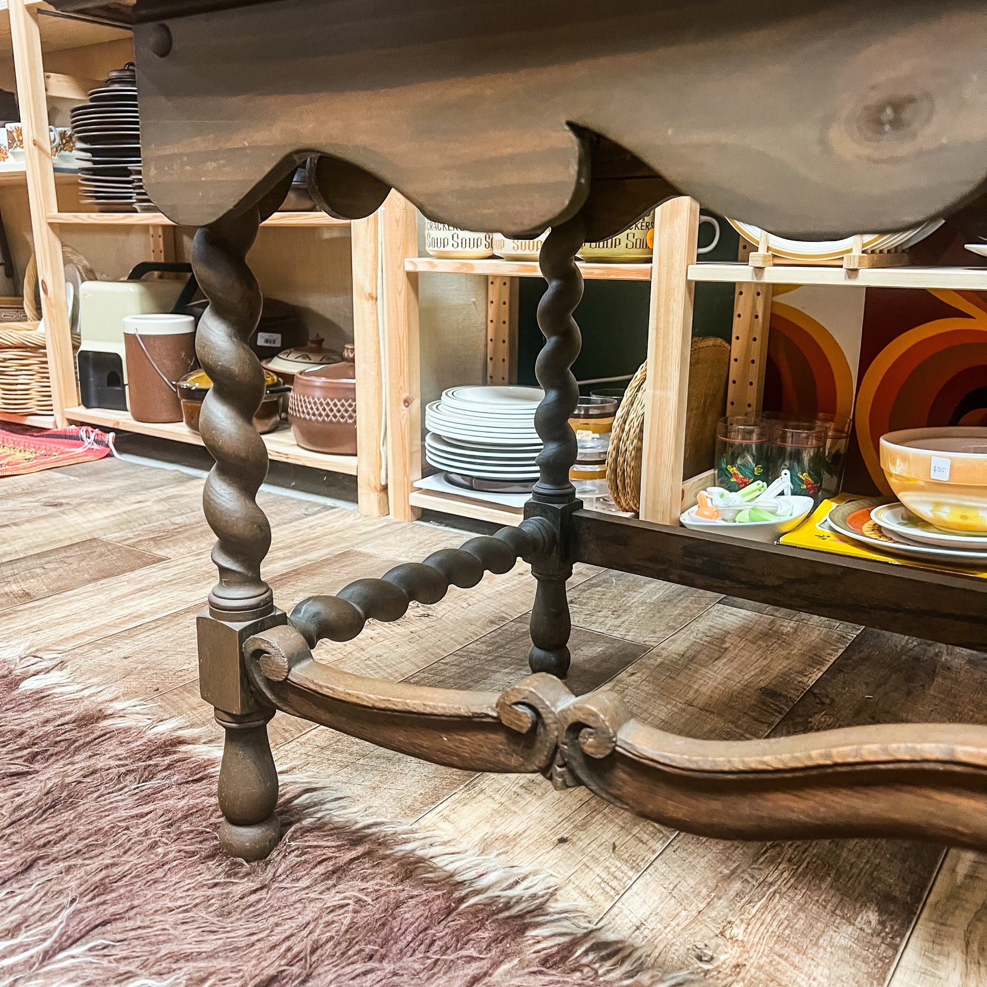 Beautiful vintage coffee table featuring a decorative ceramic tiled top set within a solid timber frame, finished with elegant turned legs and carved stretcher detailing.