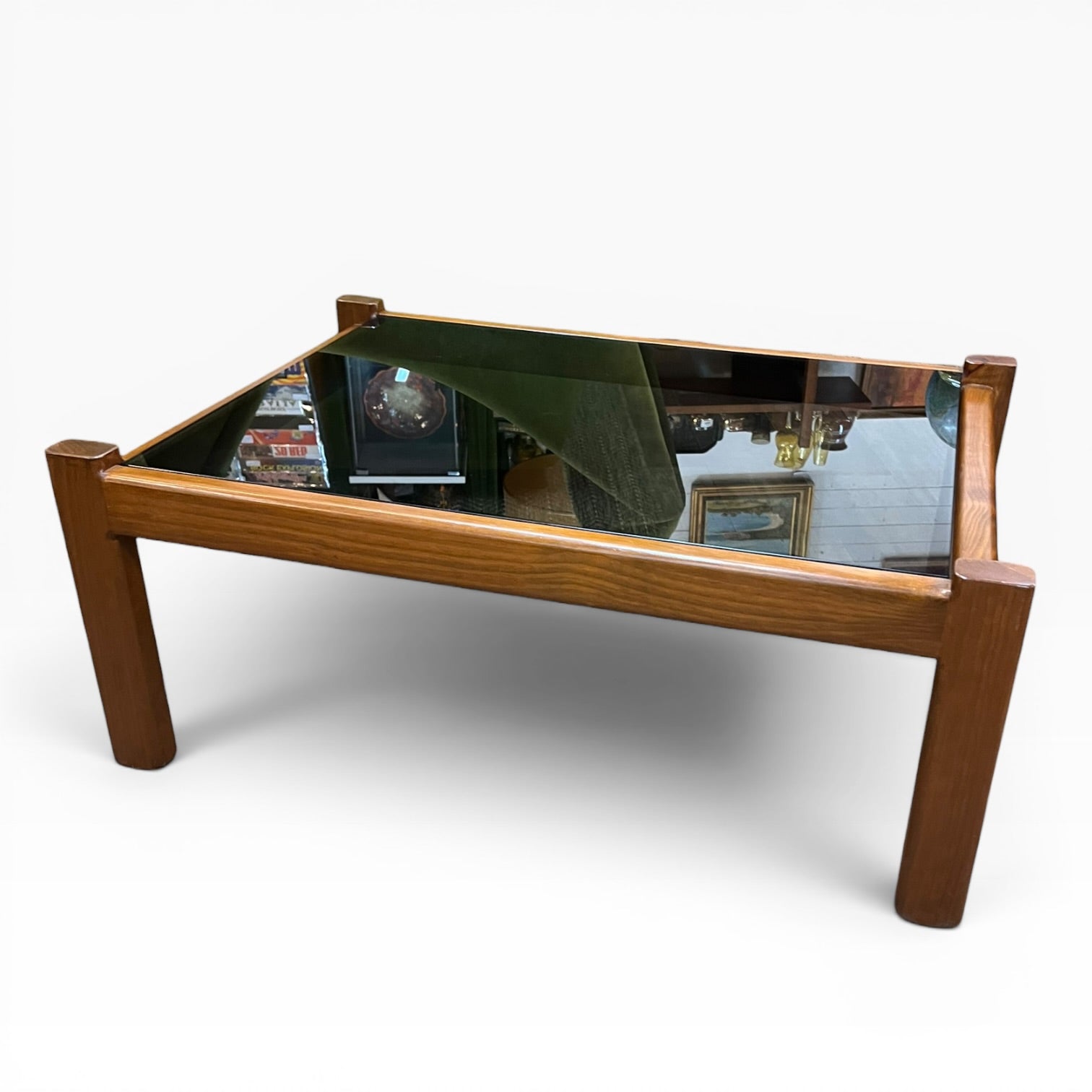 Beautiful vintage coffee table featuring a solid cedar frame paired with a sleek smoked glass top — the perfect mix of warmth and classic mid-century style.