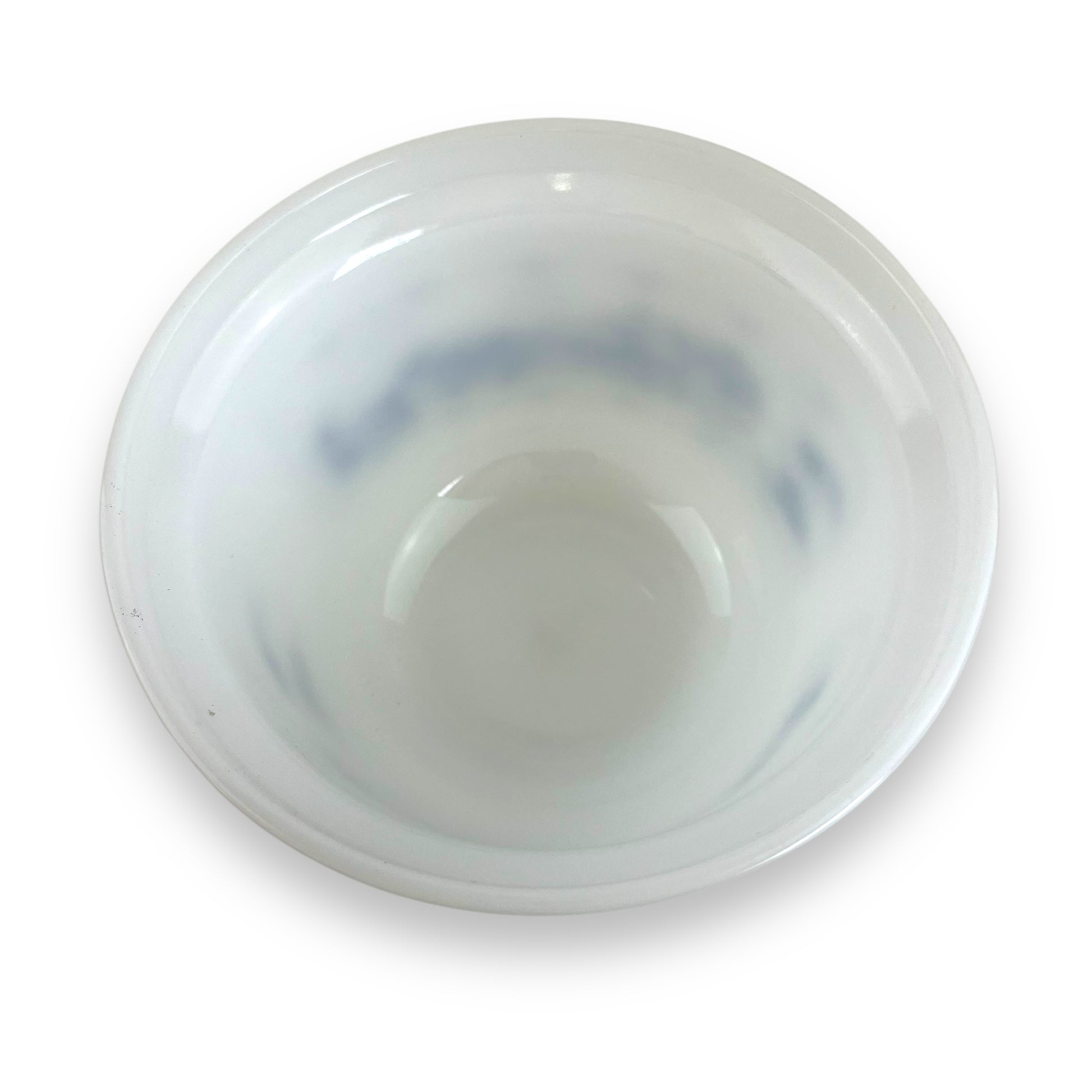 Lovely vintage Crown Oven Ware ovenproof casserole dish featuring a charming blue countryside scene on a white milk glass base. This durable and functional piece is perfect for baking, serving, and displaying in your vintage kitchen.