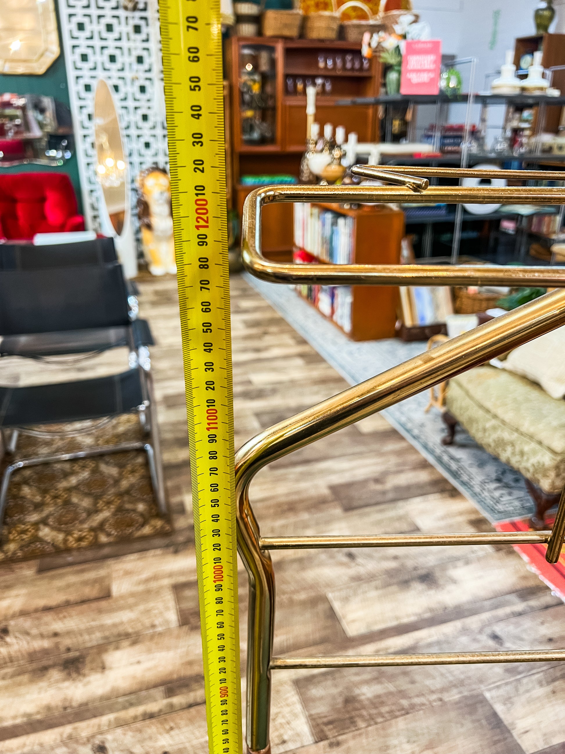 A striking mid-century gentleman’s valet chair, combining sculptural brass-toned metal framing with warm timber detailing and a green upholstered seat. Designed to hold clothing neatly overnight, this piece features multiple rails for jackets, shirts and trousers, with a padded seat for convenience.