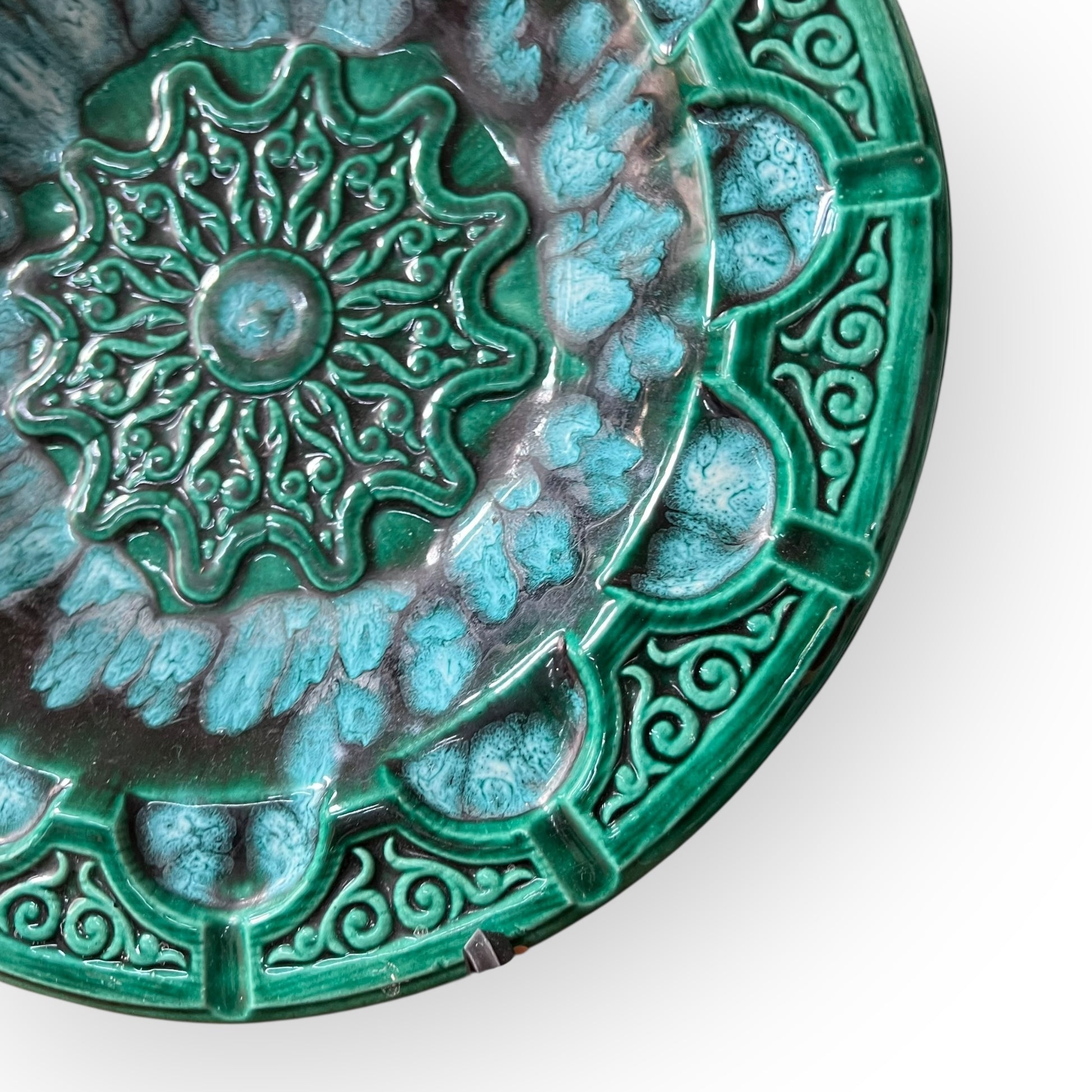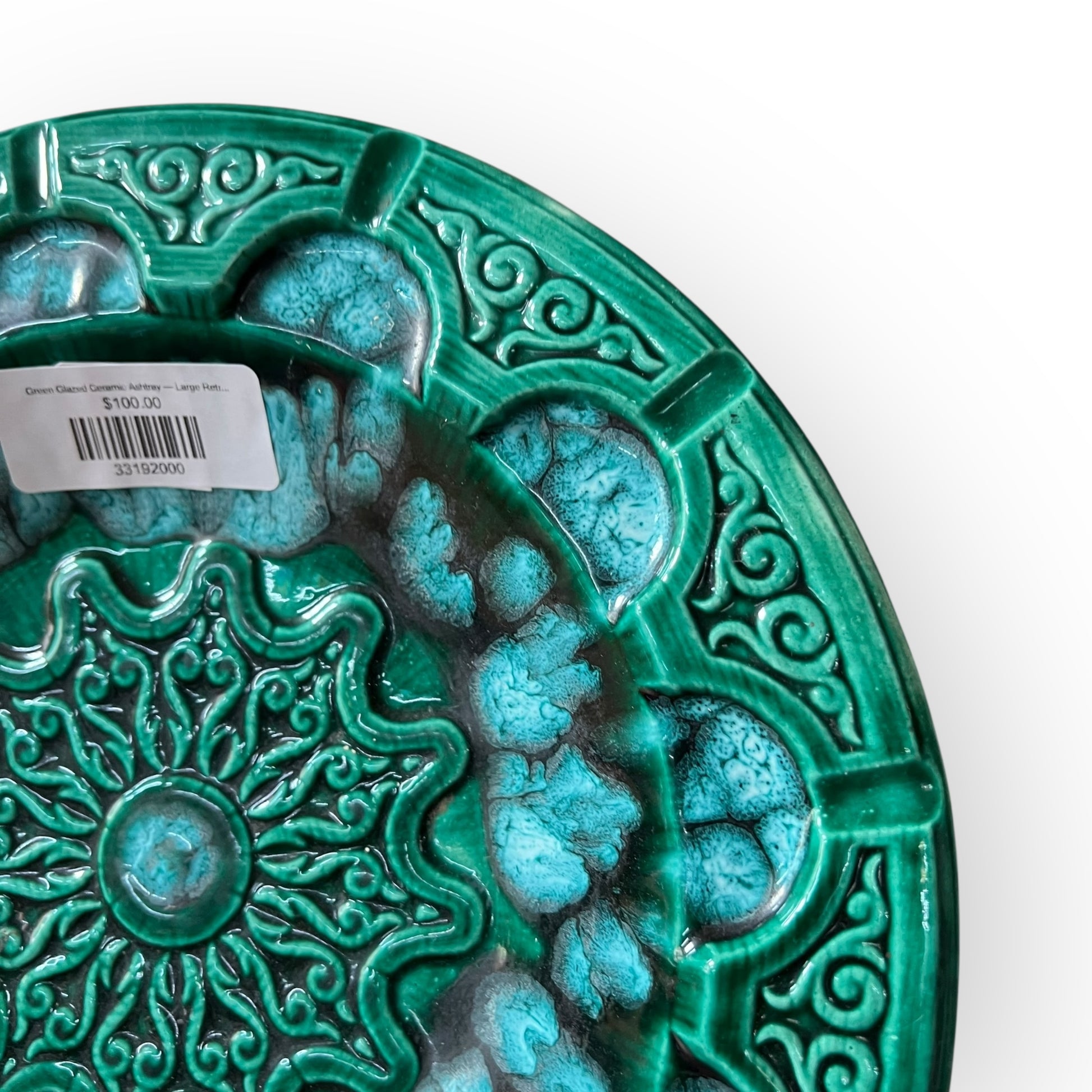 Stunning mid-century ceramic ashtray featuring a richly textured design and vibrant emerald–teal glaze. This piece has a beautiful mandala-style pattern with deep relief detailing that catches the light and shows off the layered glaze perfectly.