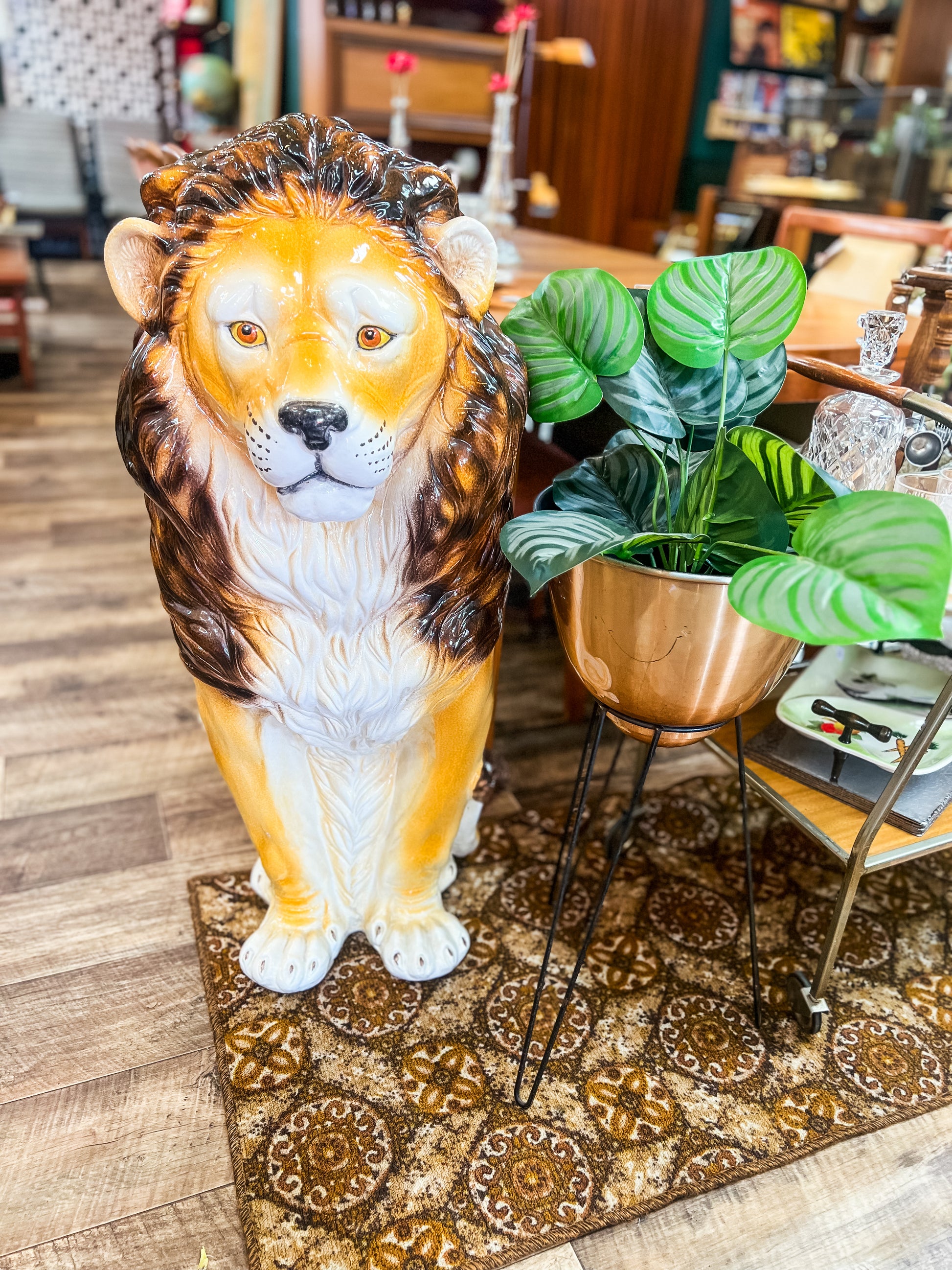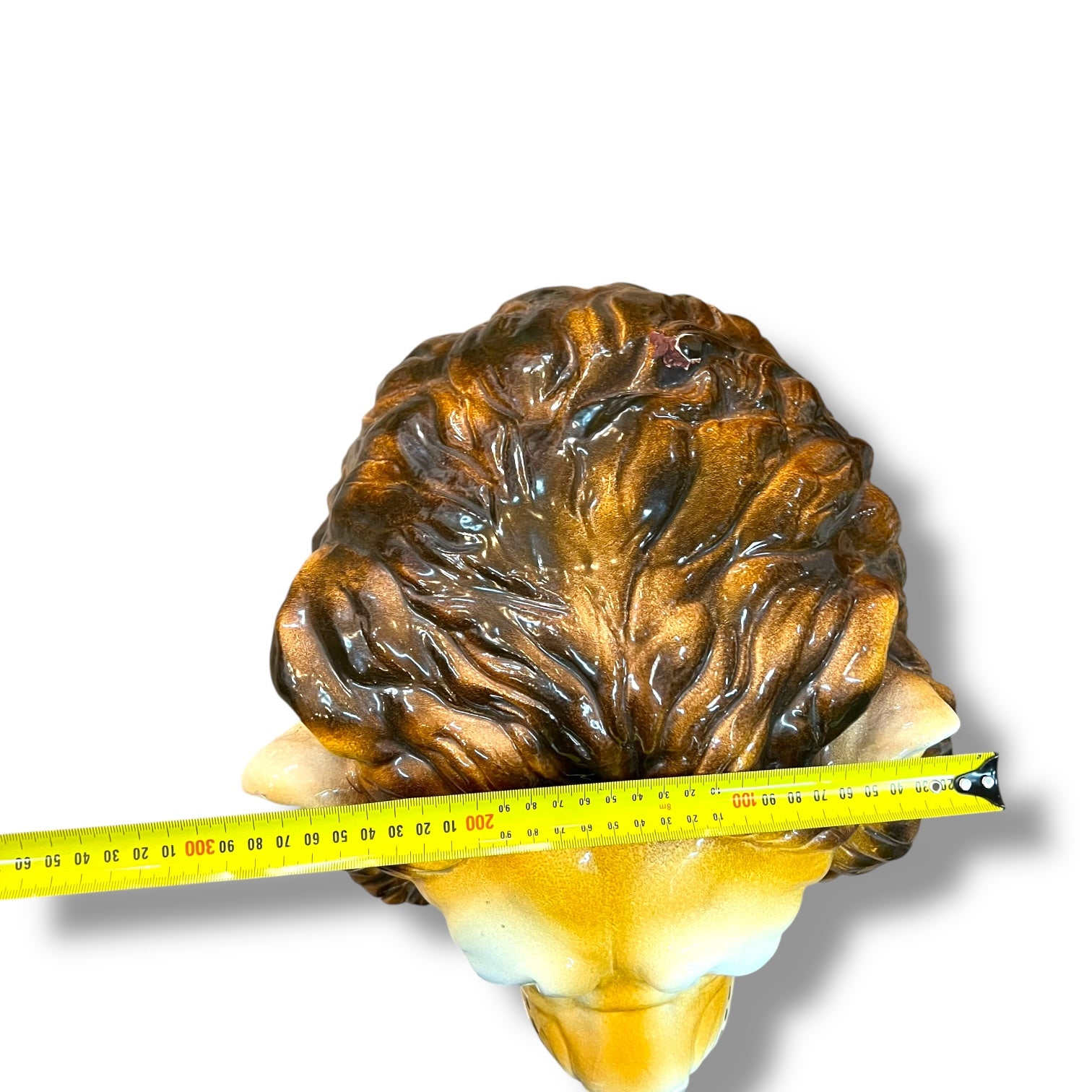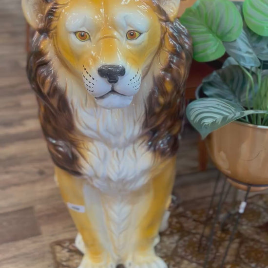 Commanding attention with its striking presence, this vintage Italian ceramic lion is a true statement piece for any collector or interior space. Standing approximately 90cm tall, it features beautifully hand-painted detailing in warm golden tones with a deep brown mane and expressive eyes that bring it to life.