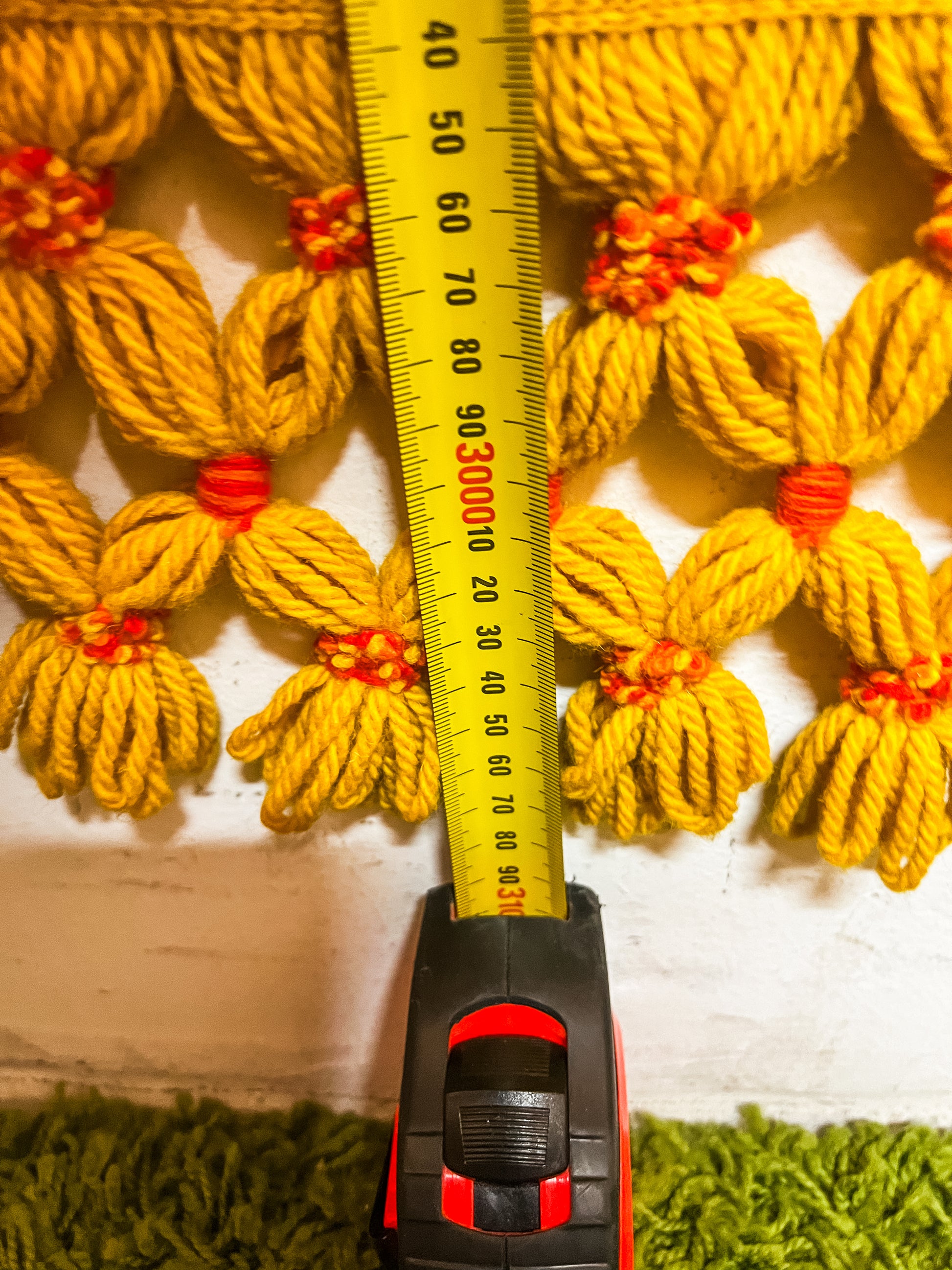 A bold and eye-catching large vintage wool rug featuring an intricate orange and yellow pattern with ornate floral and scrolling motifs. Finished with a decorative tassel fringe border, this piece has a strong retro and bohemian feel, making it a standout statement for any space.