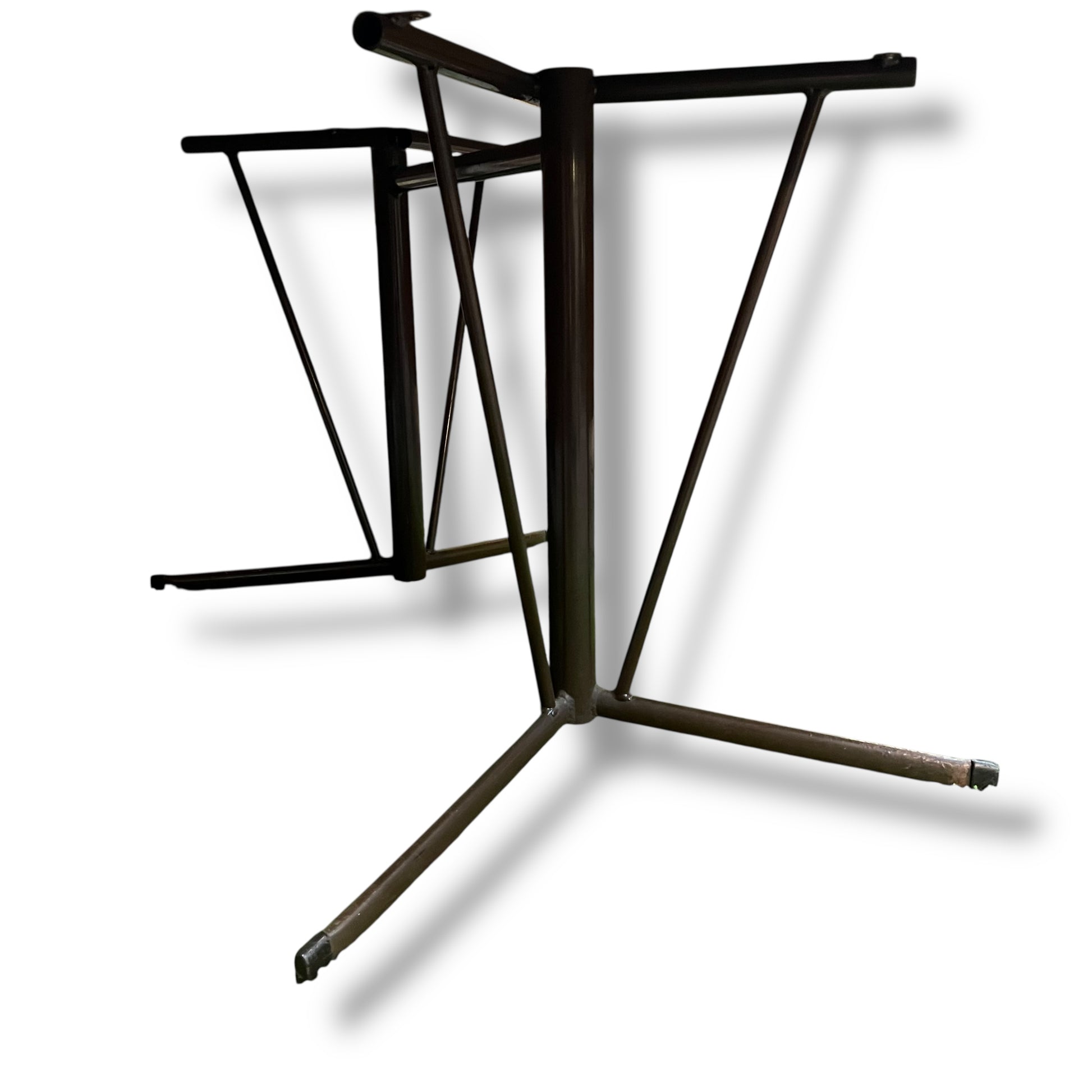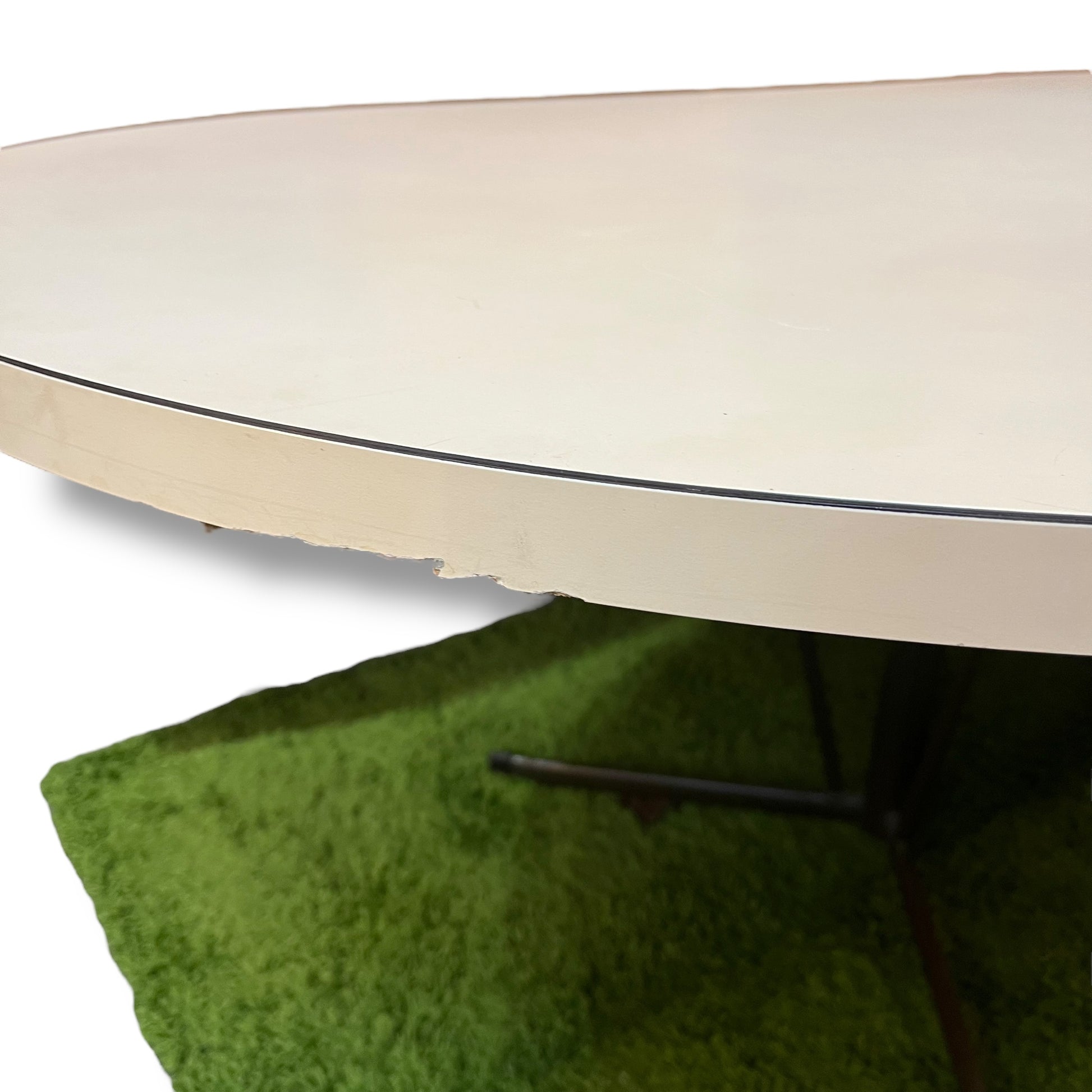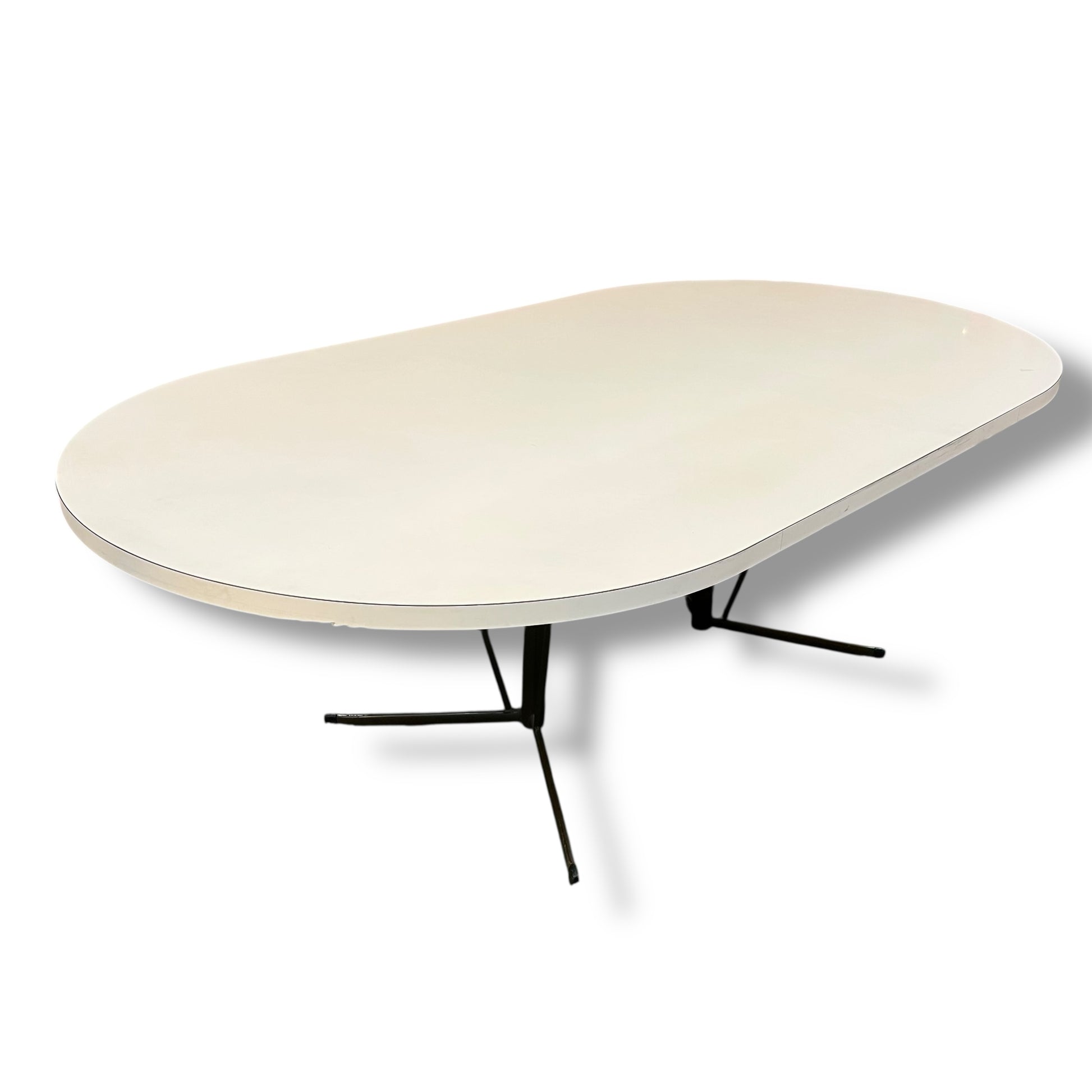 Vintage mid-century oval dining table featuring a cream laminate top and a sculptural metal tripod-style base. The minimalist silhouette and neutral tones make it a versatile choice for retro, industrial, or contemporary interiors.