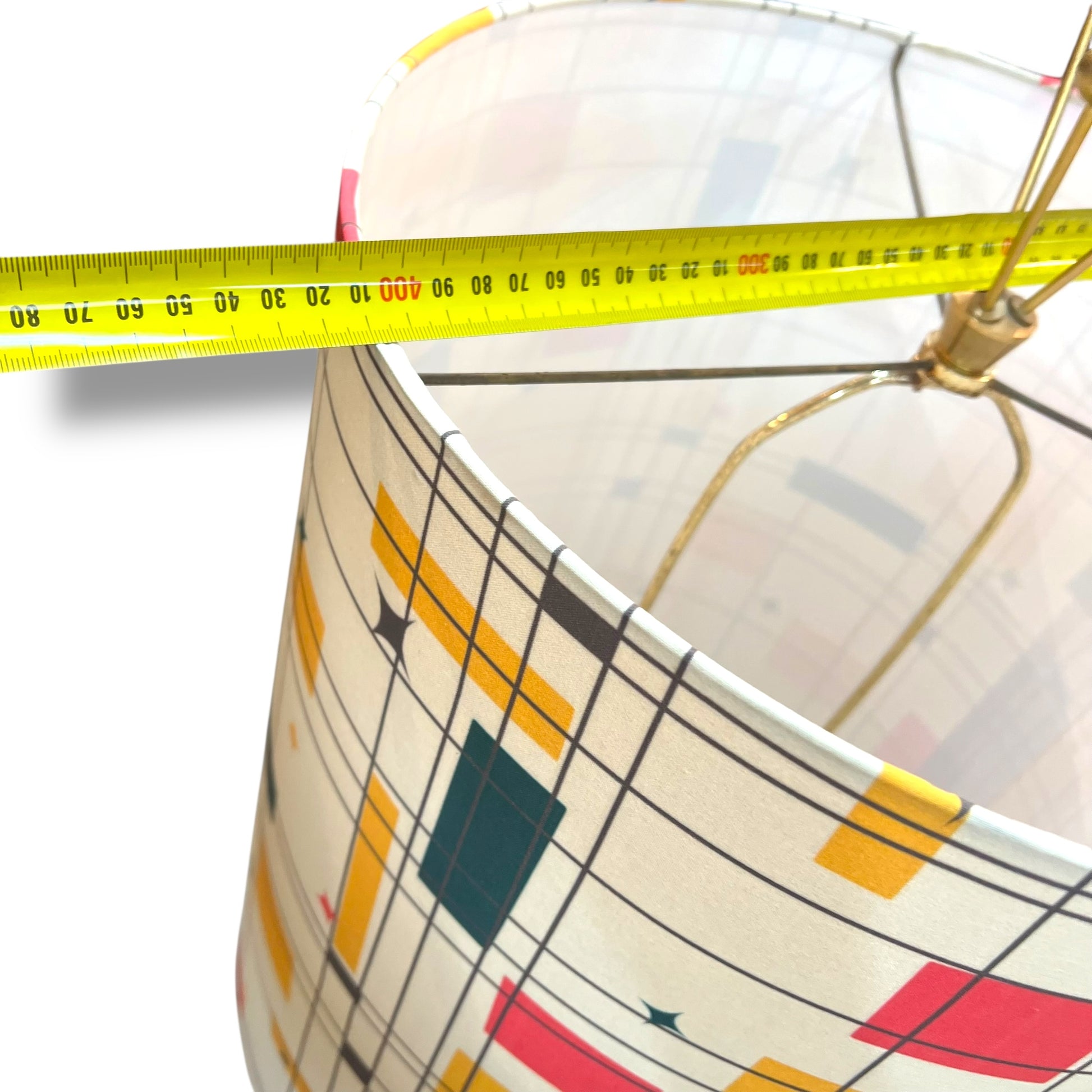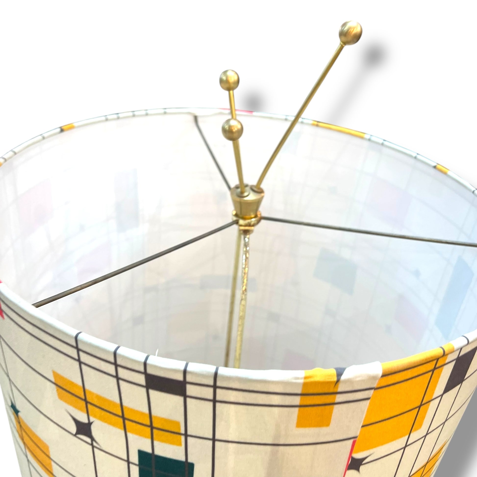 Stylish mid-century modern floor lamp featuring a solid teak stem and brass tripod base, paired with a vibrant atomic-inspired drum shade. The shade’s geometric pattern — in mustard yellow, coral red, teal, and black — channels the playful optimism of the 1950s while adding a bold statement to any interior.