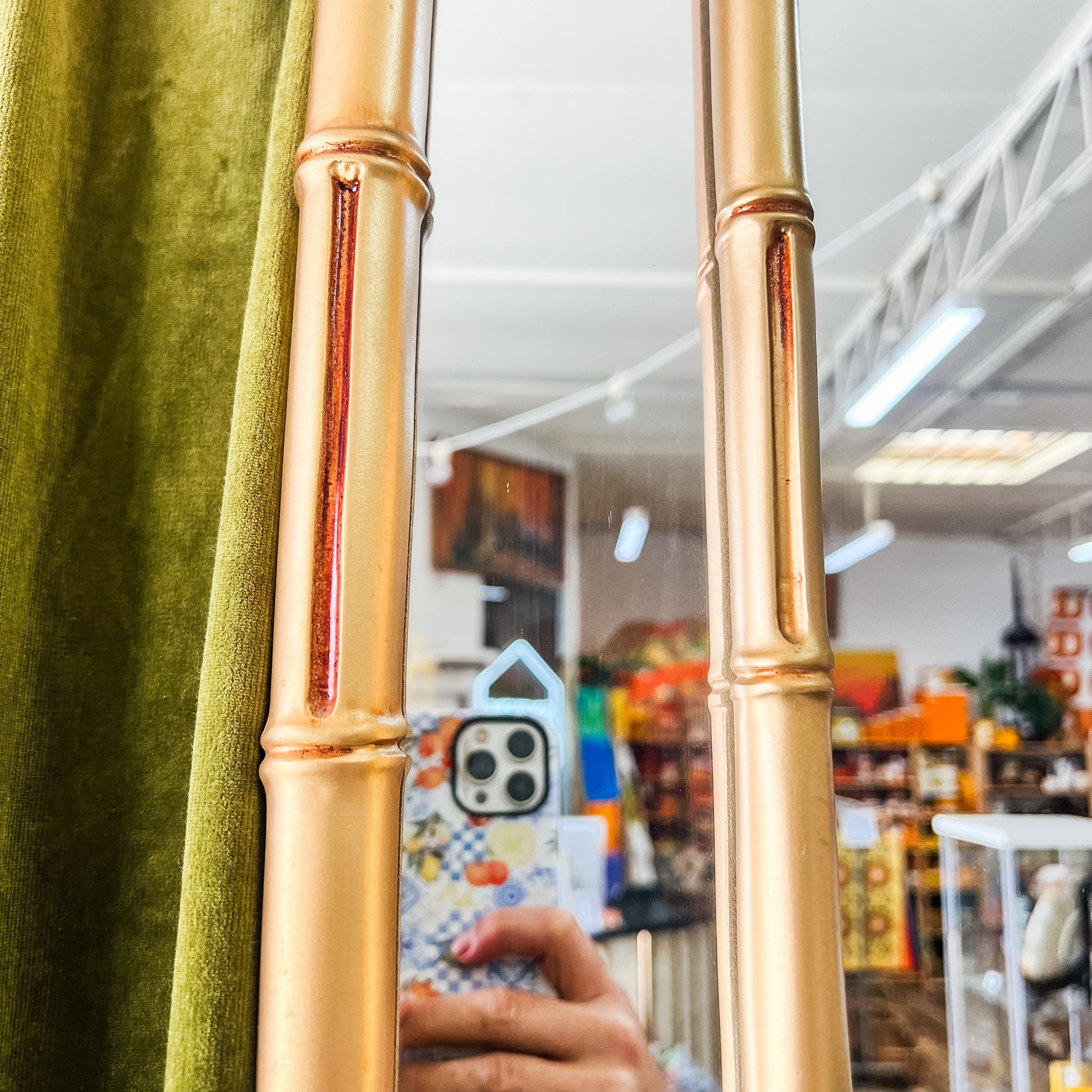 Statement octagonal wall mirror featuring a faux bamboo frame in a warm gold tone. Made from lightweight plastic, this piece delivers the classic Hollywood Regency / Palm Beach look without the weight of real bamboo or metal.