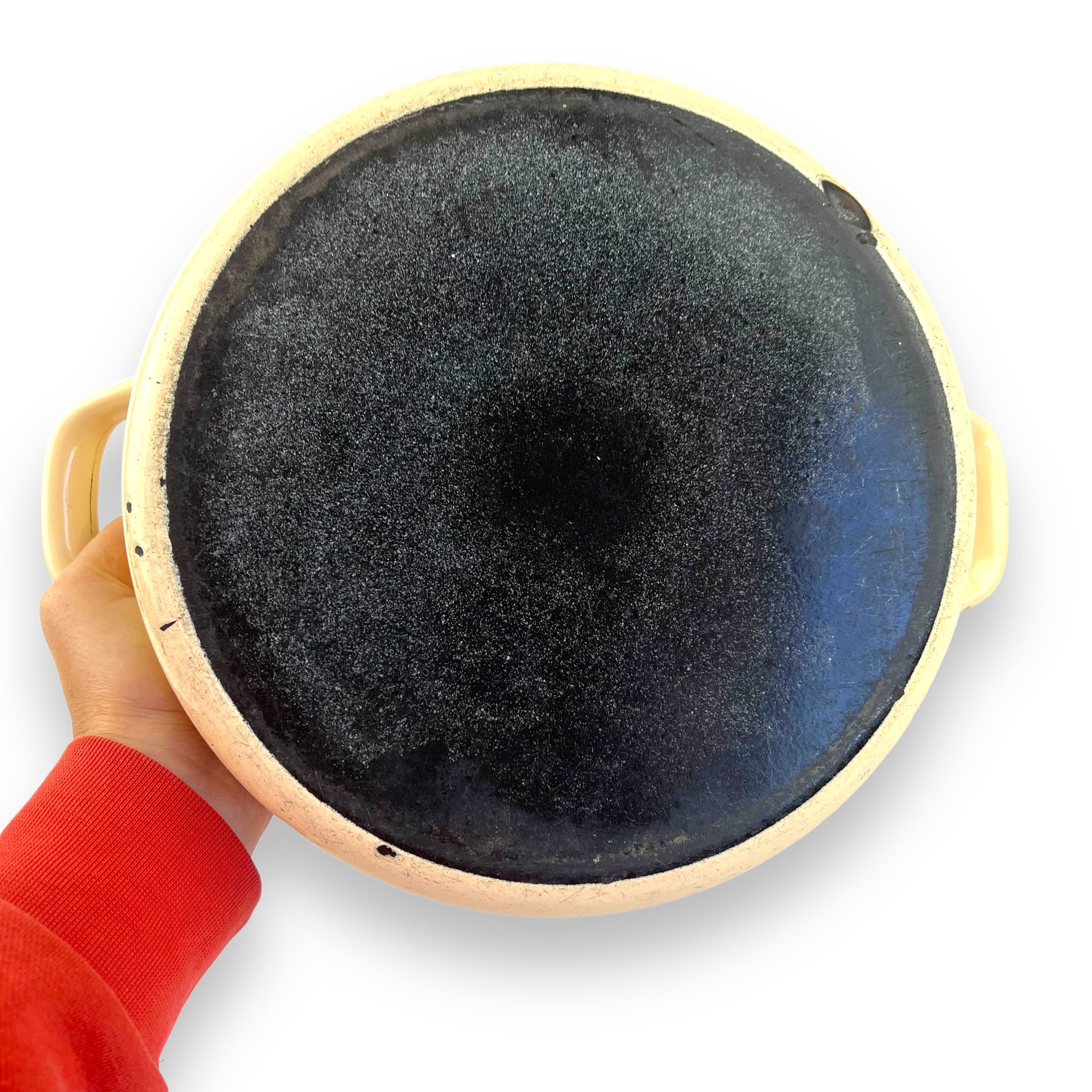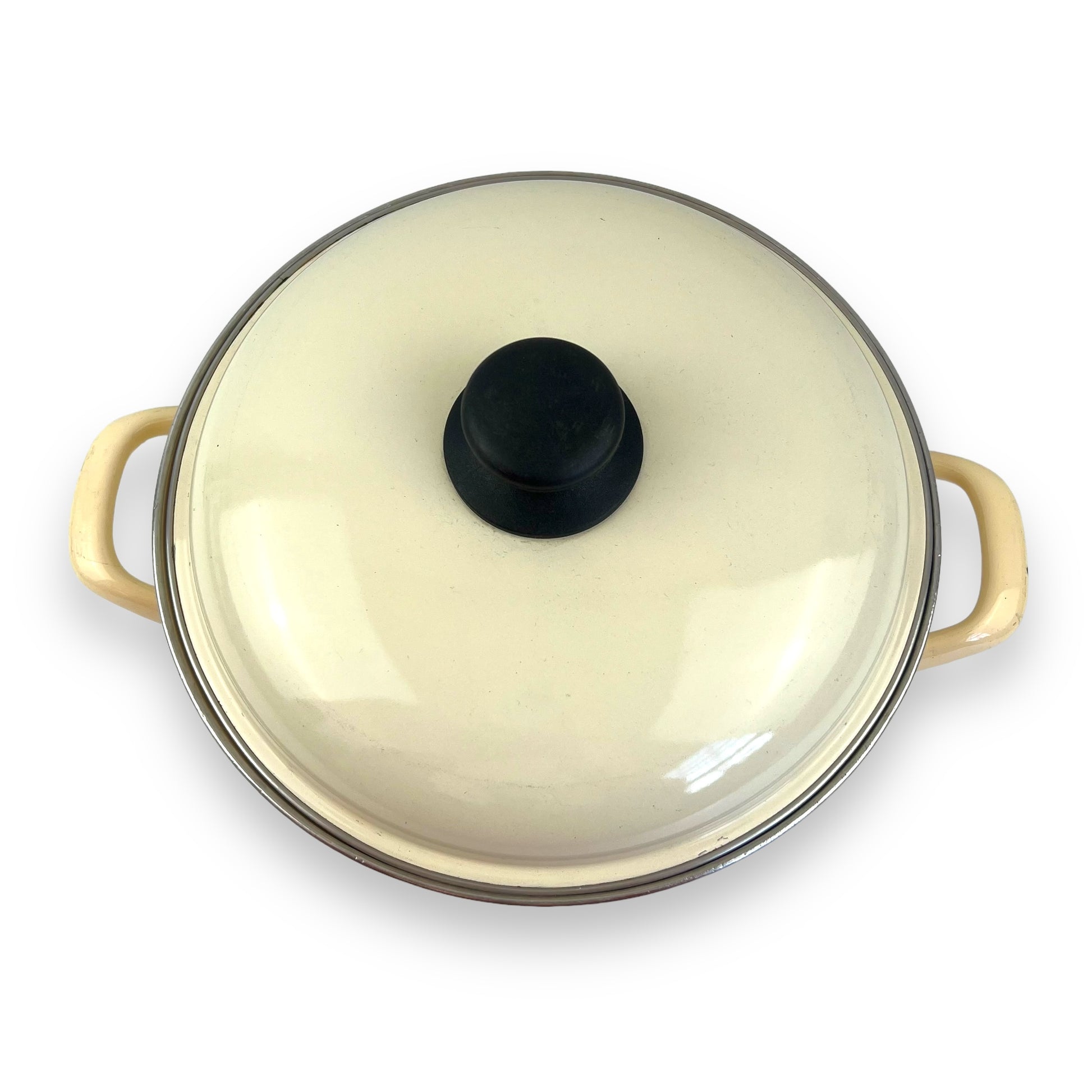 This large orange and brown stripe cream enamel cooking pot features two handles and a lid, making it perfect for preparing soups and large dishes. Its vintage design adds a touch of nostalgia to any kitchen.