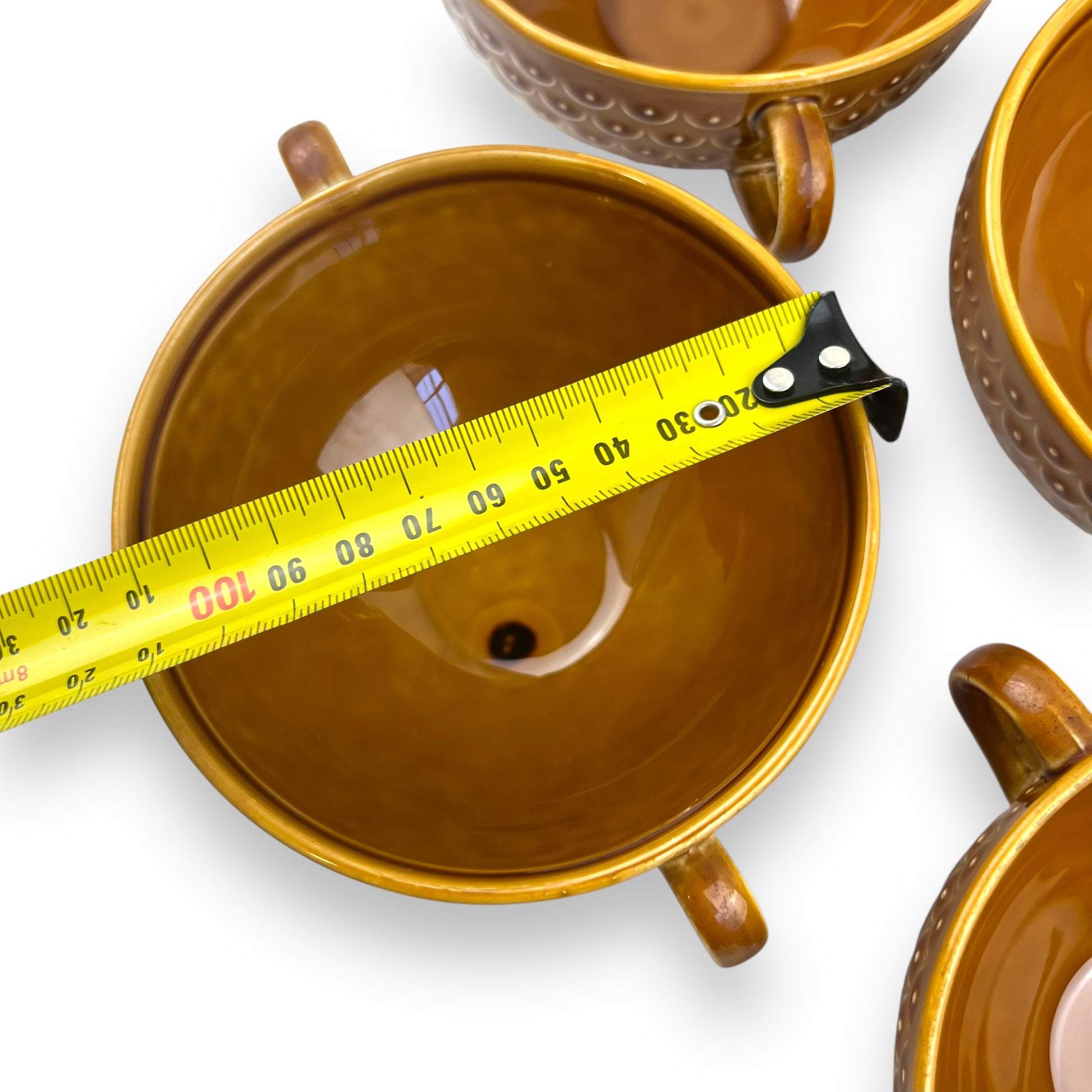 Made in Italy, this gorgeous vintage set from Pagnossin features 8 matching earthenware bowls with a rich caramel-brown glaze and a raised circular dot pattern. Each bowl has twin handles and a sturdy base, perfect for soups, stews, or serving up retro charm at your next dinner party.