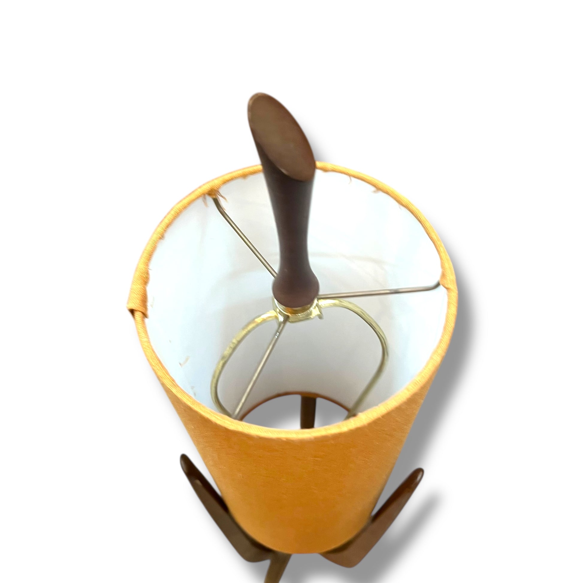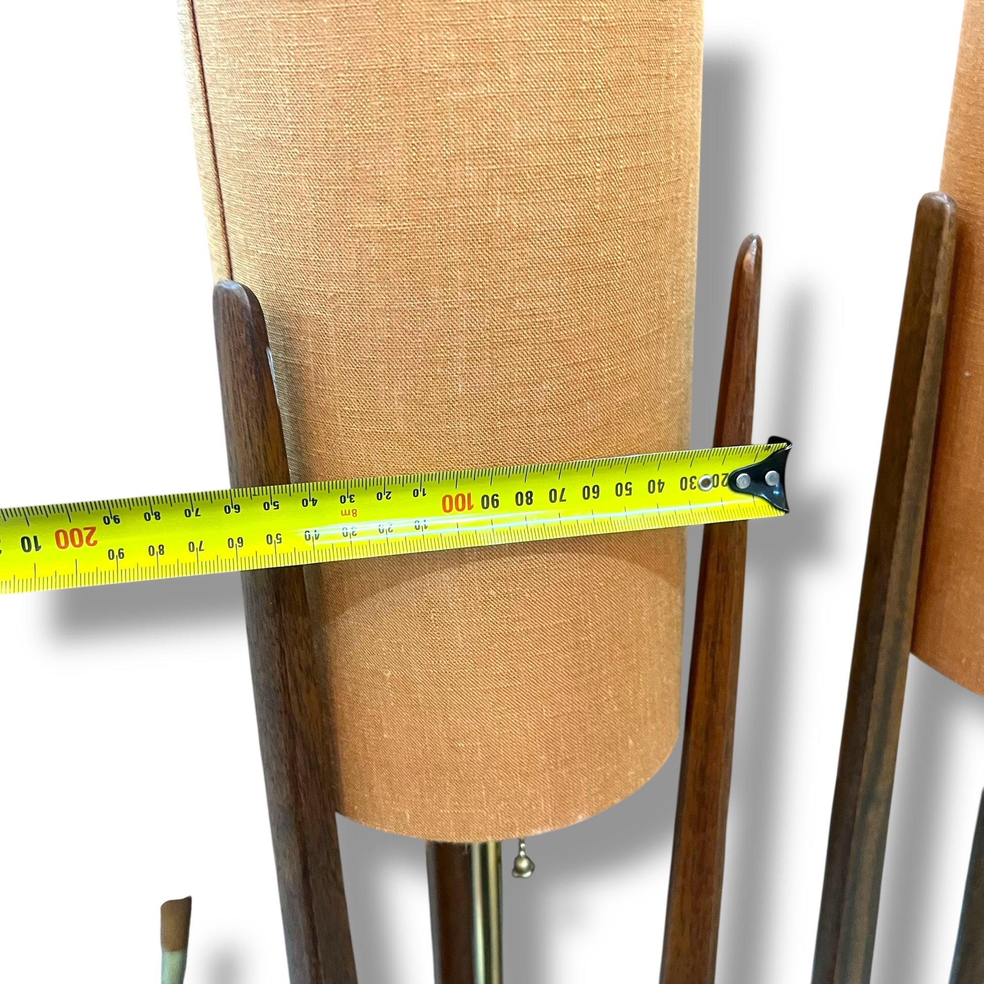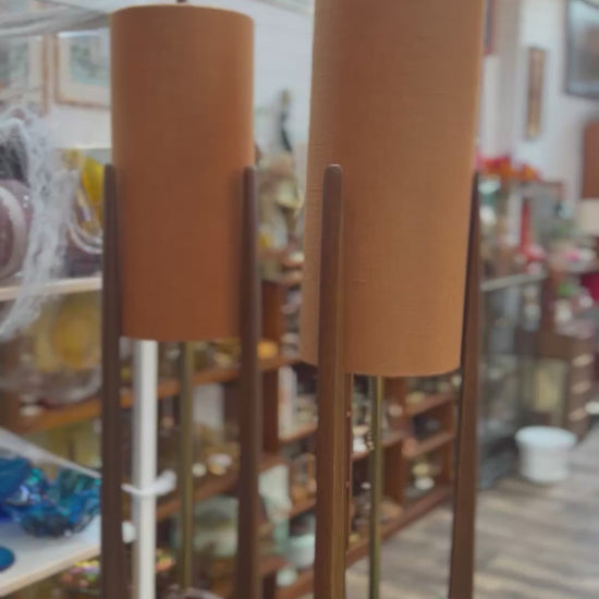 A striking pair of mid-century sculptural rocket lamps designed by Adrian Pearsall for Modeline of California, circa 1960s. These lamps feature beautifully curved walnut tripod bases, sleek brass centre stems, and their original tapered cylindrical orange fabric shades with matching sculpted walnut finials.