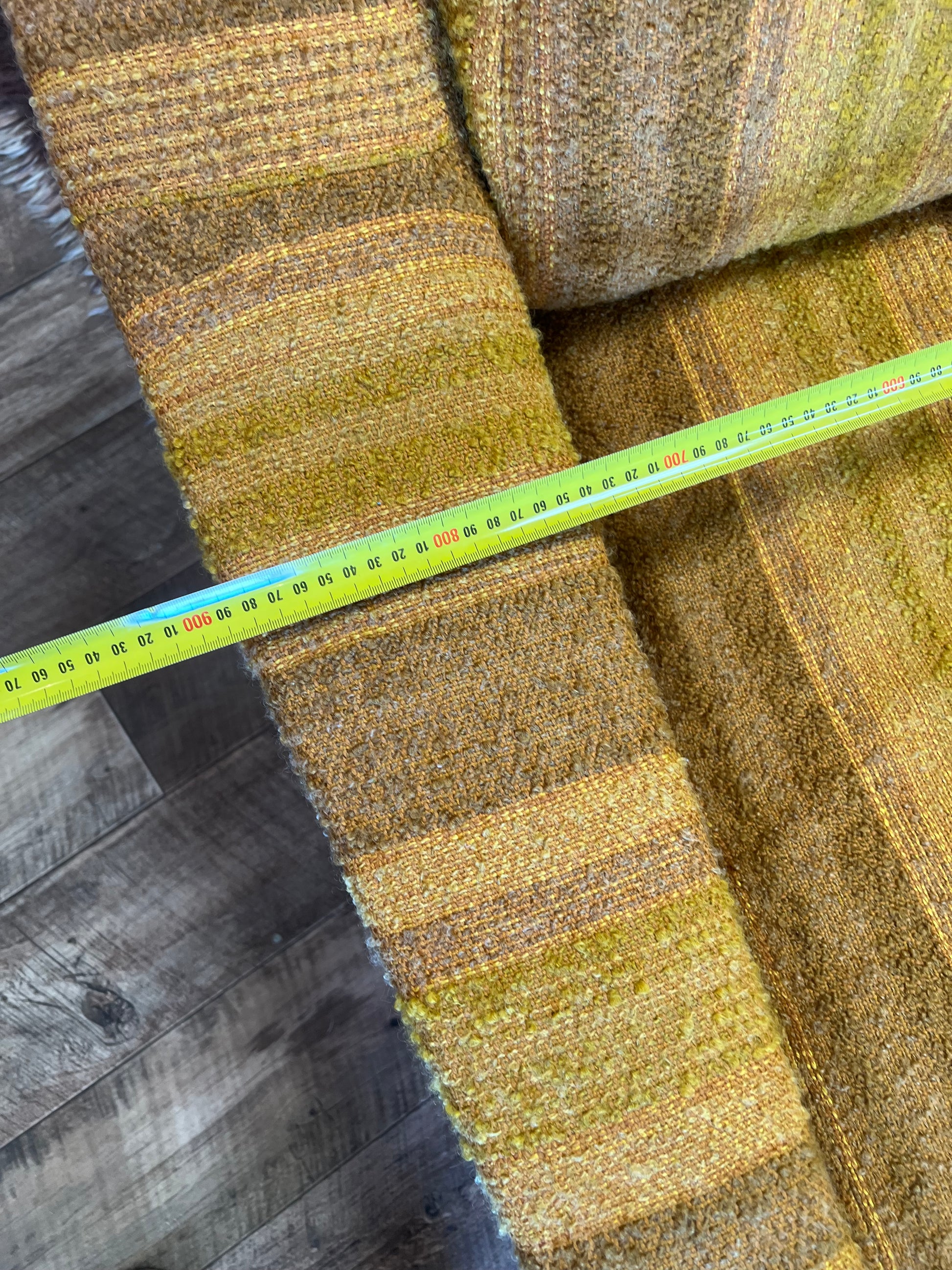 • Upholstery: Textured striped fabric in mustard/brown tones