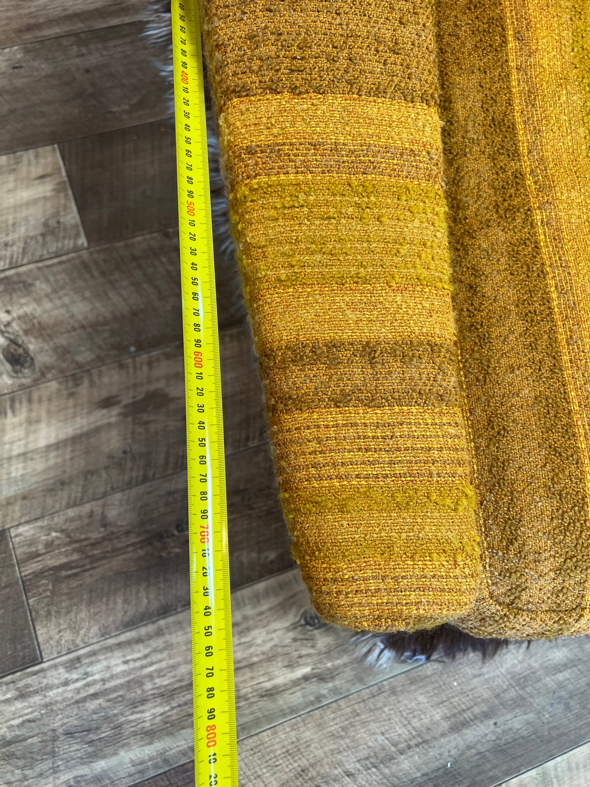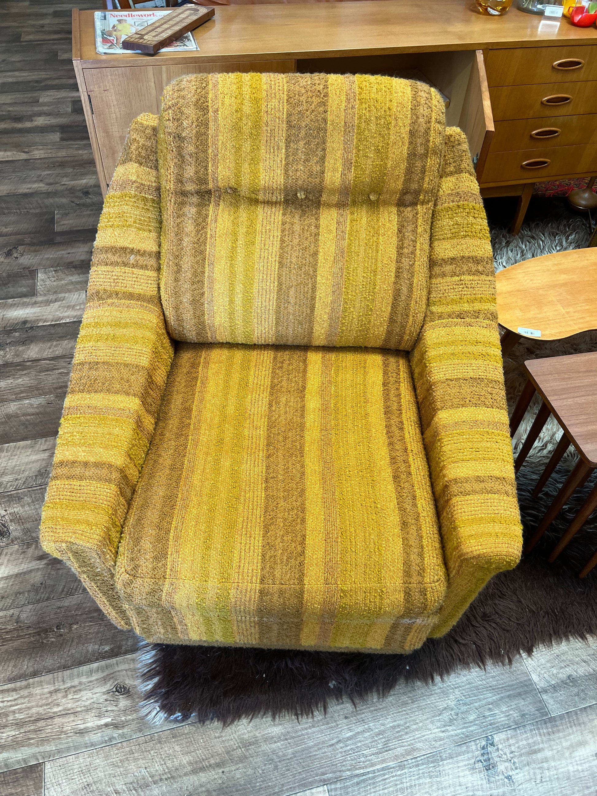 Upholstered in an incredible mustard, caramel and brown striped textured fabric, this chair is full of warmth and retro character. The armrests are firm (no cushioning), giving it a sleek structured look while still being super comfortable to lounge in.