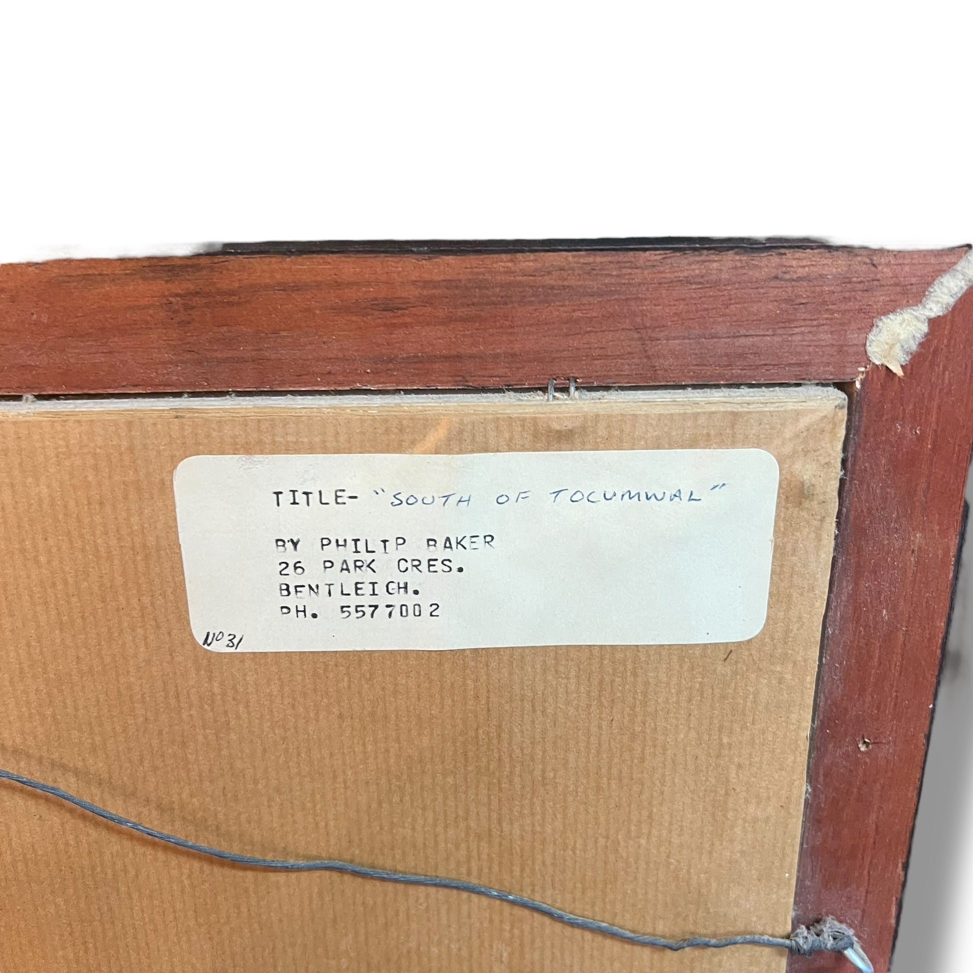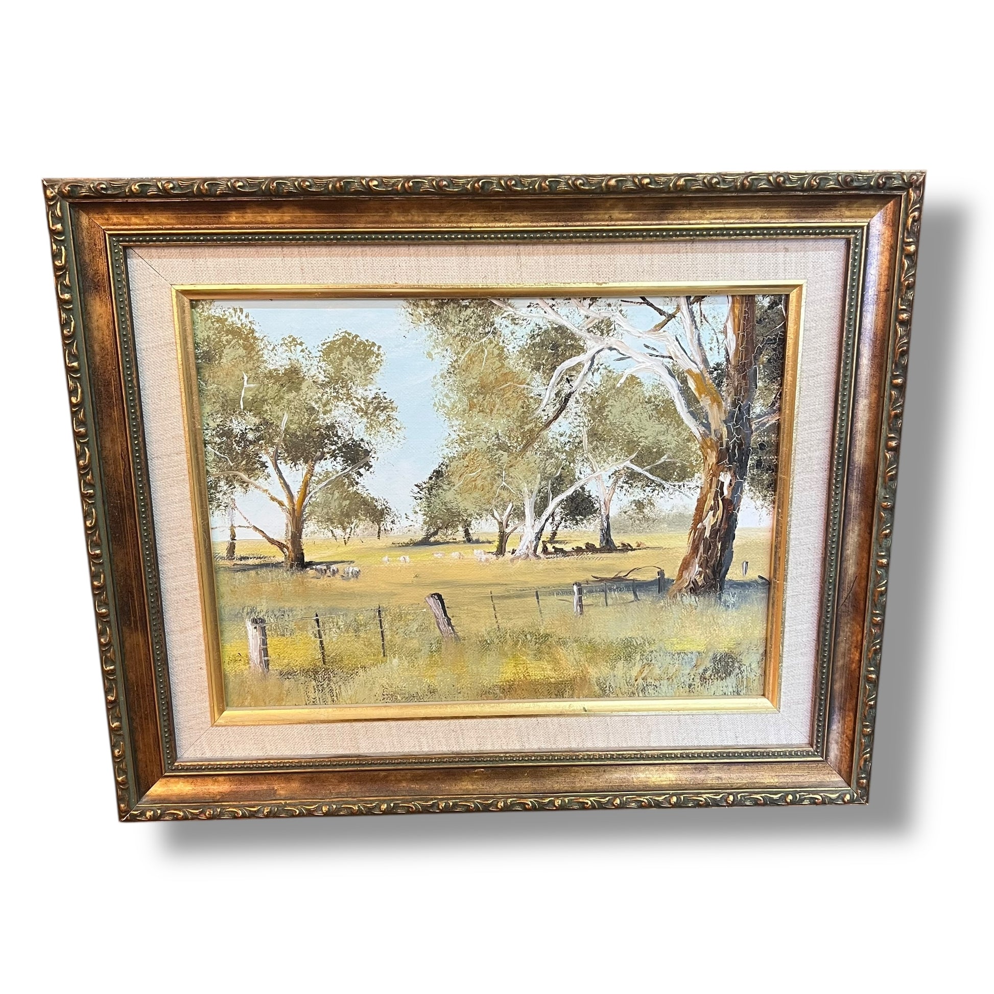 A beautiful original oil painting by Victorian artist Philip Baker, titled “South of Tocumwal”. This soft, light-filled pastoral scene features sheep grazing beneath tall gum trees, with warm tones and gentle brushwork capturing the serenity of rural New South Wales.