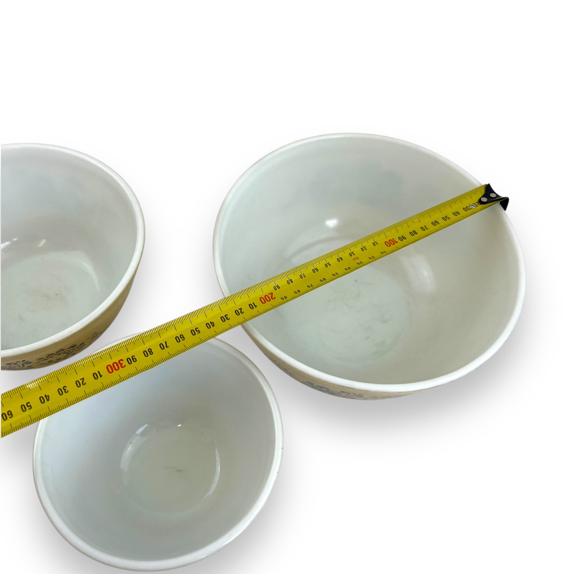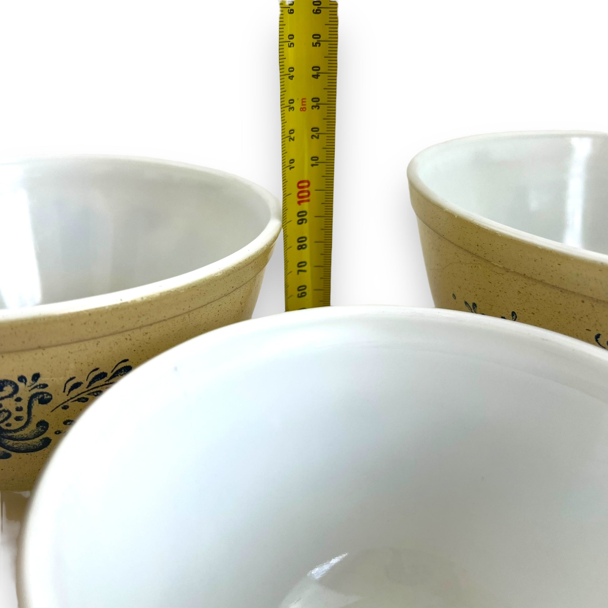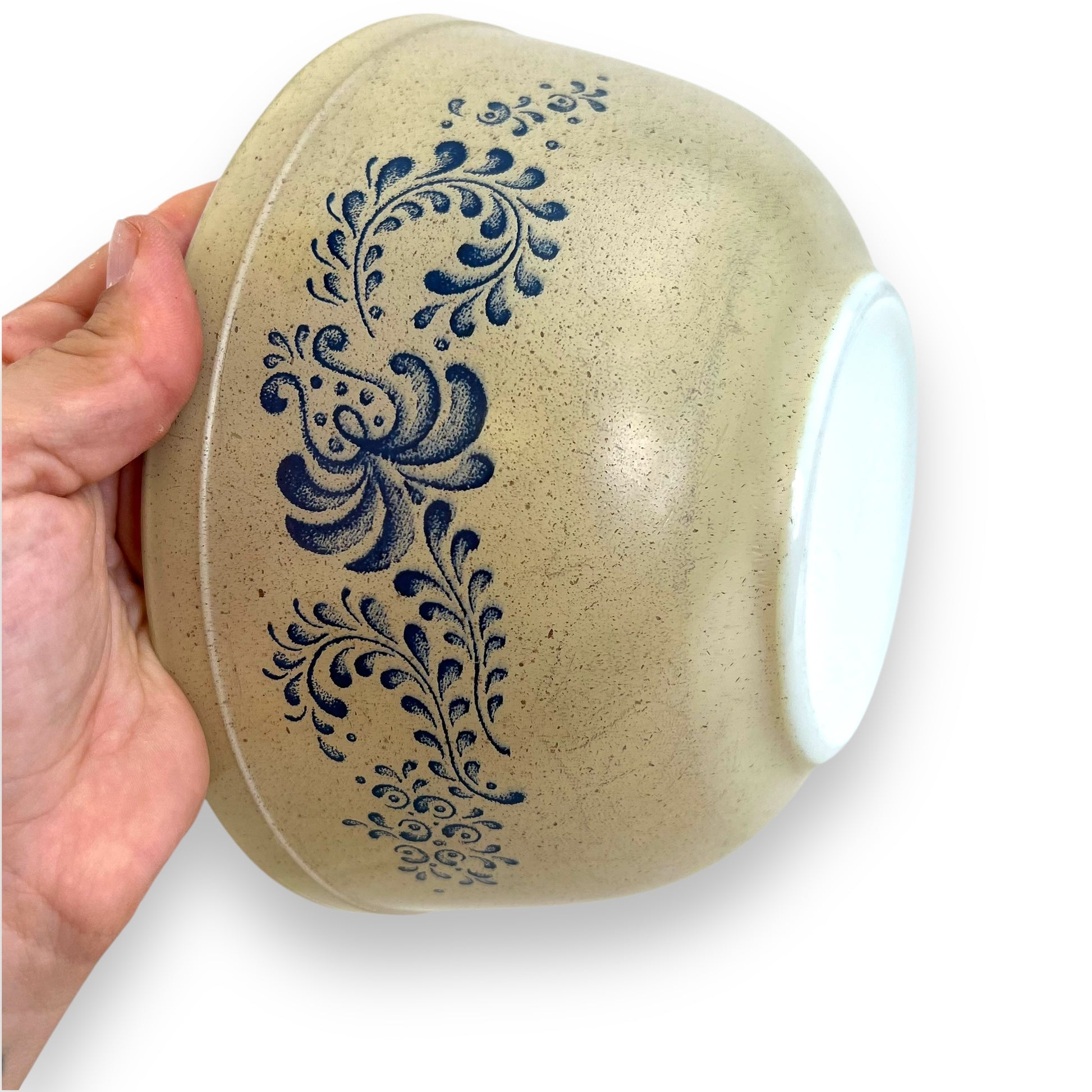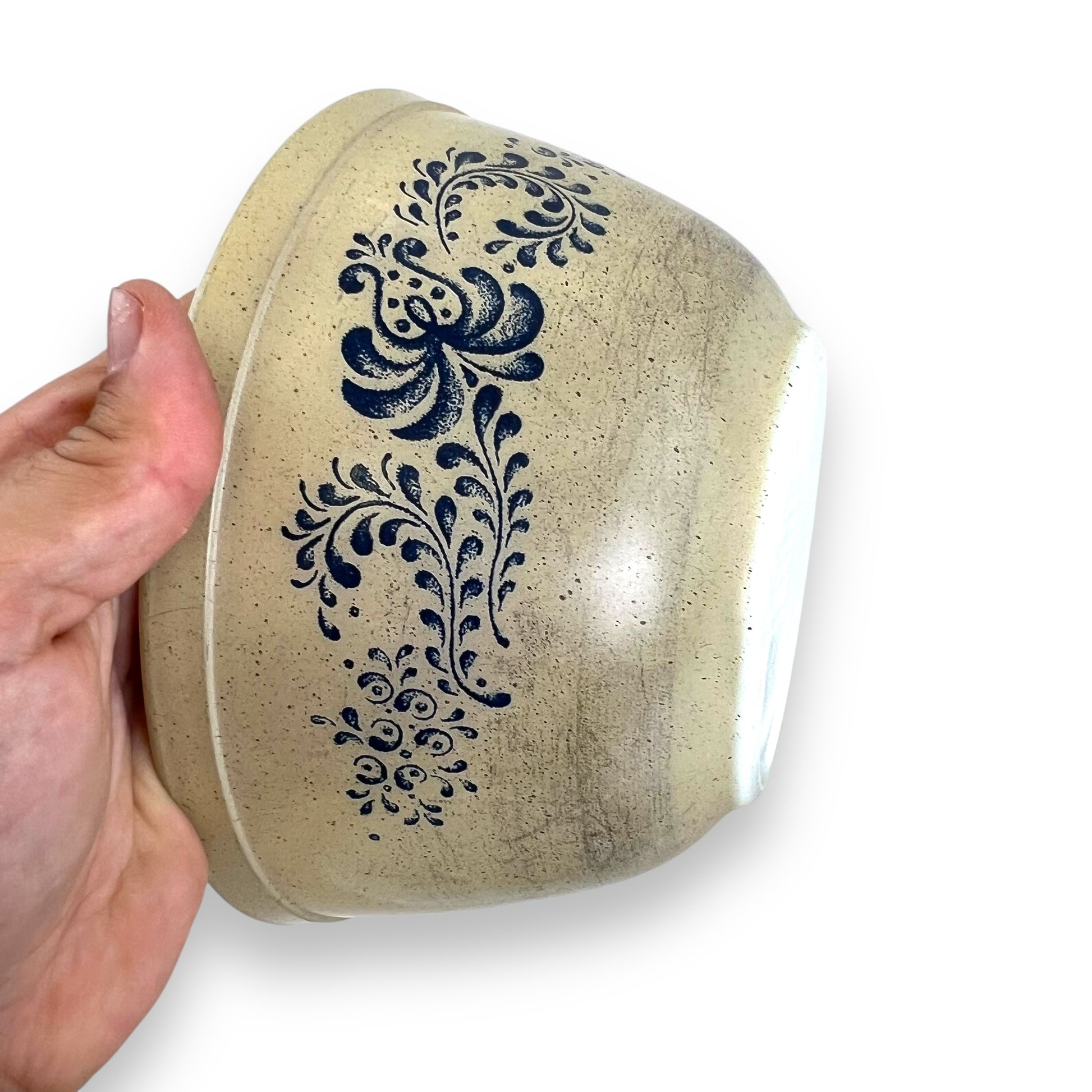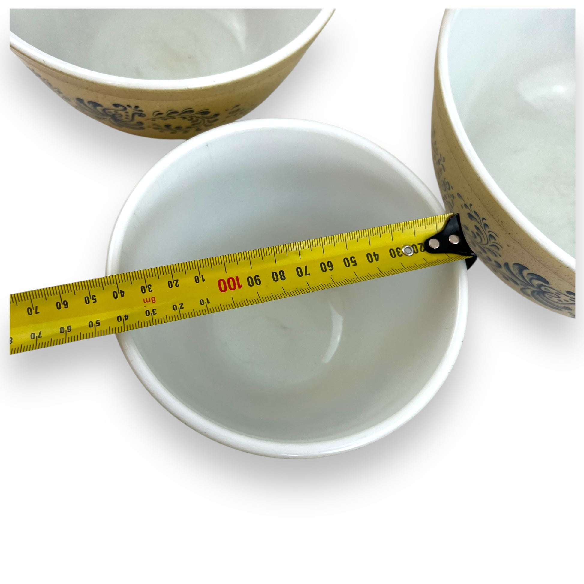 This vintage Pyrex Blue Homestead mixing bowl set is a charming addition to any farmhouse or country-style kitchen. Featuring a warm beige base with a classic blue floral pattern, these bowls are both functional and collectible.