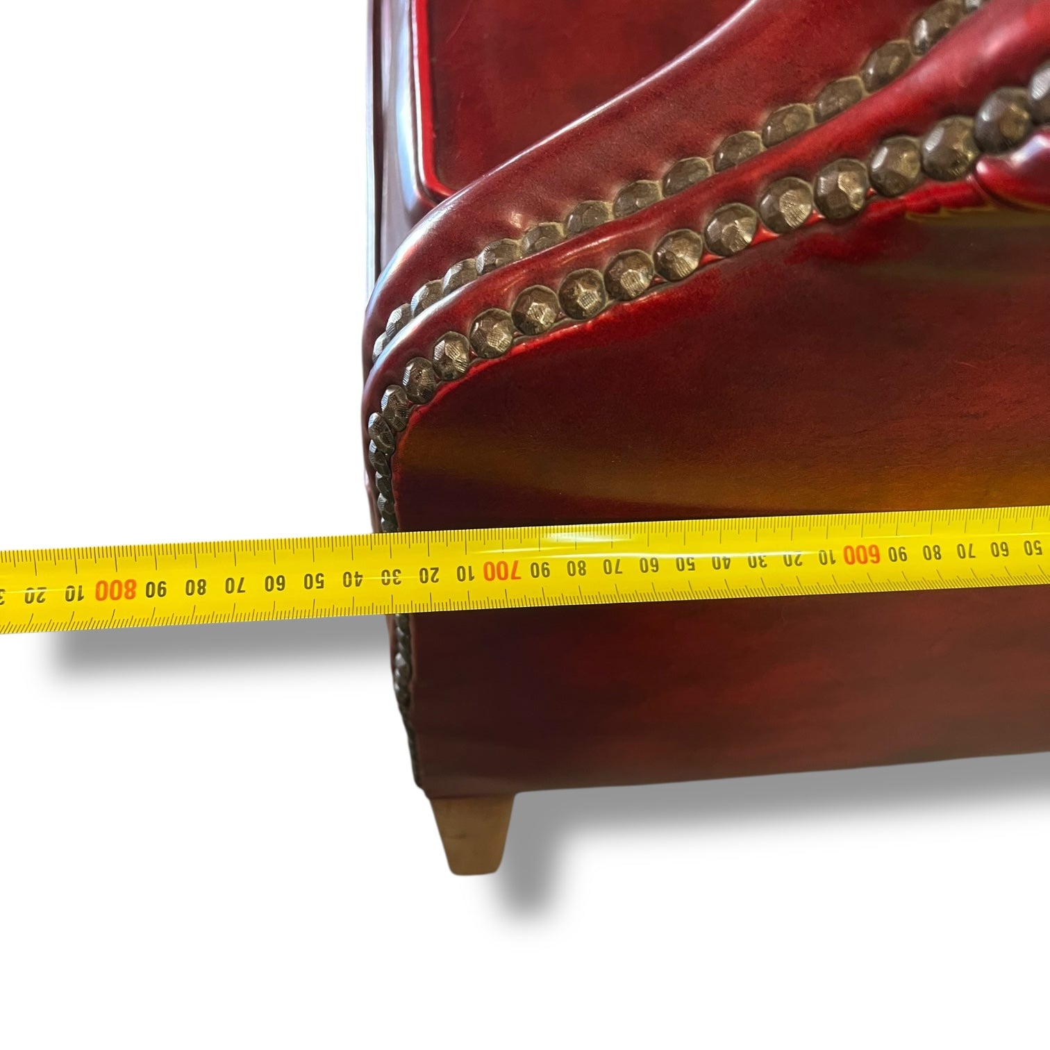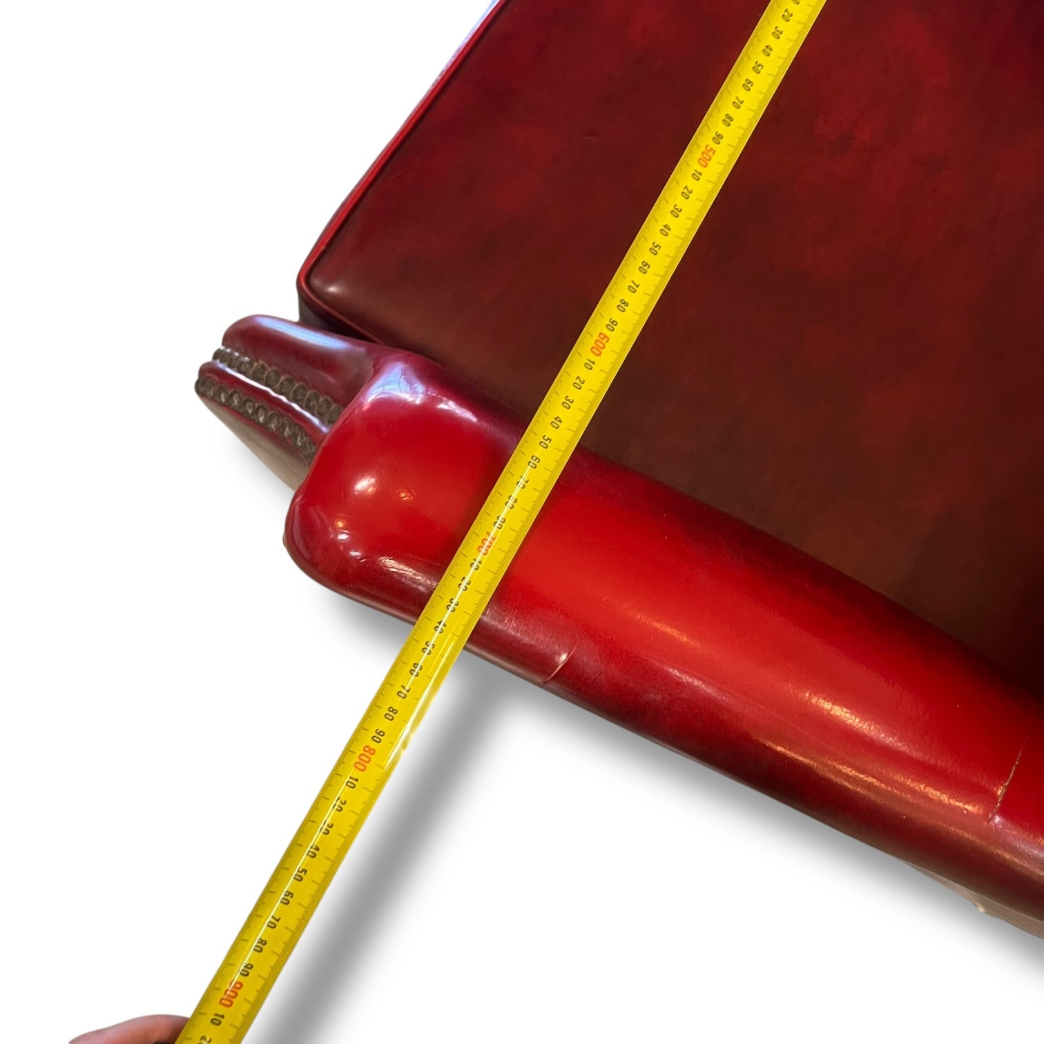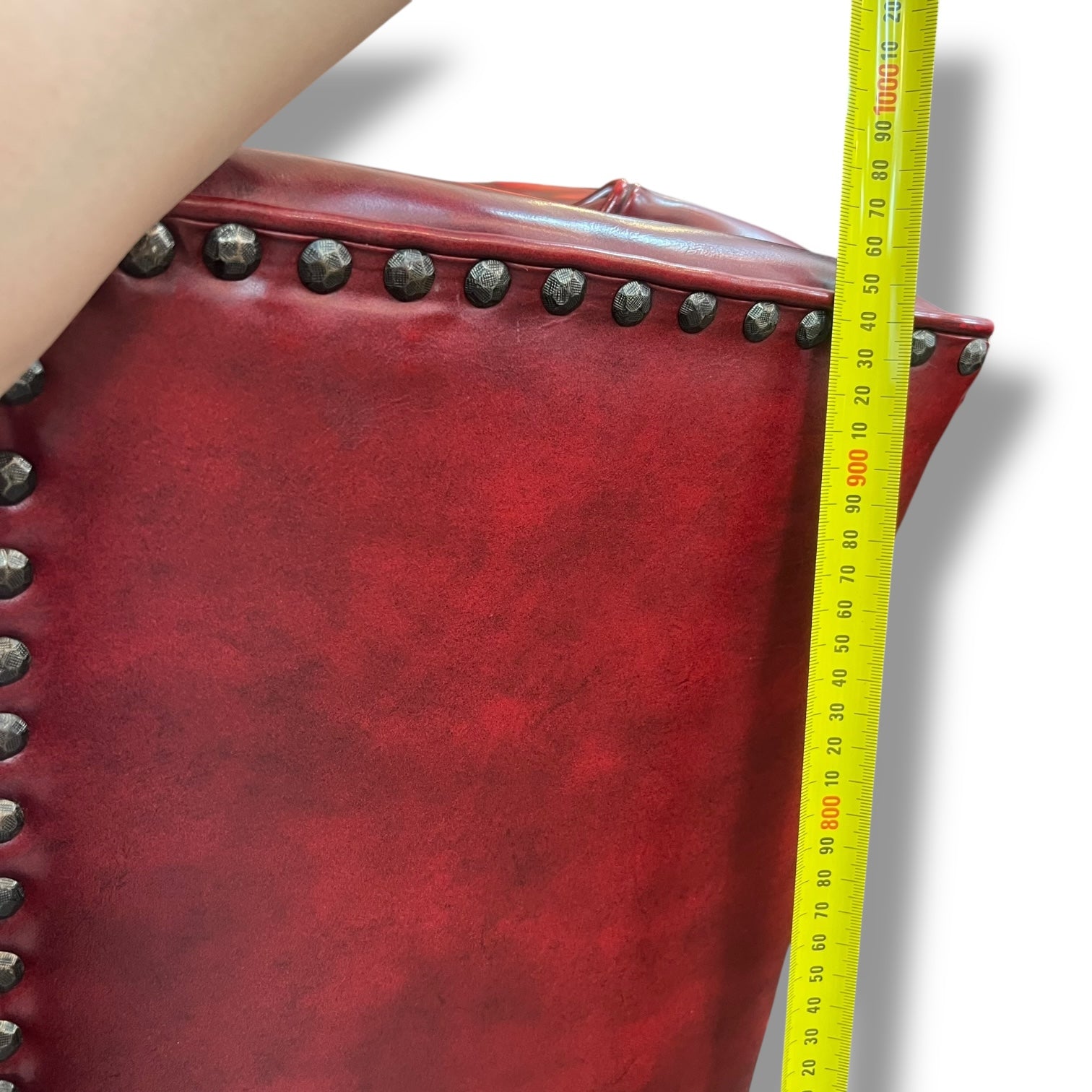 Striking vintage red wingback armchair featuring a bold deep red leather upholstery with button-tufted back, rolled arms, and decorative brass stud trim. The tall back and generous cushioning make it a statement piece that’s as comfortable as it is eye-catching.