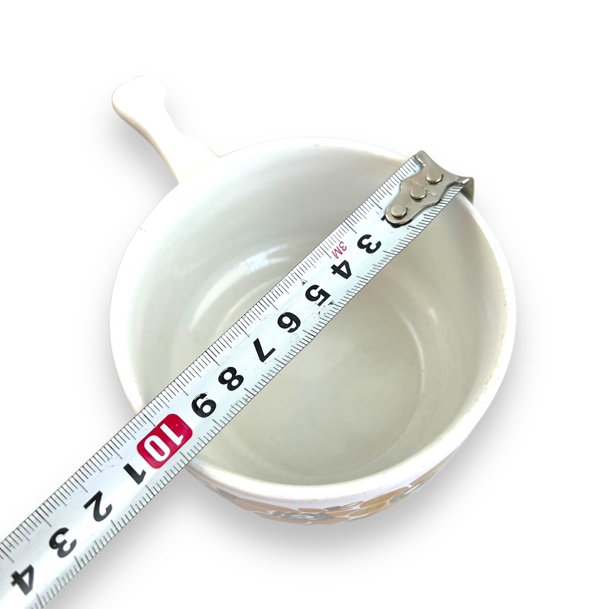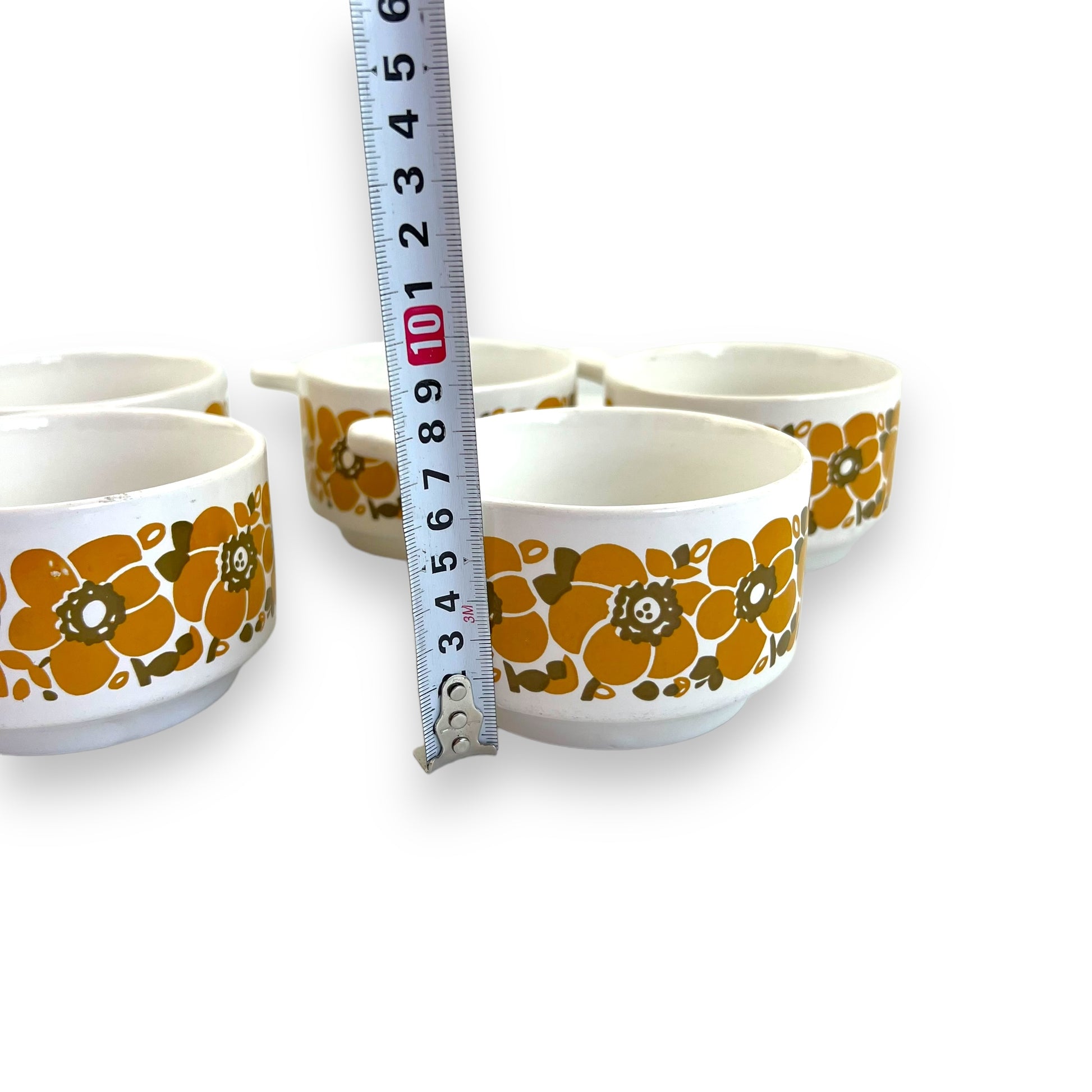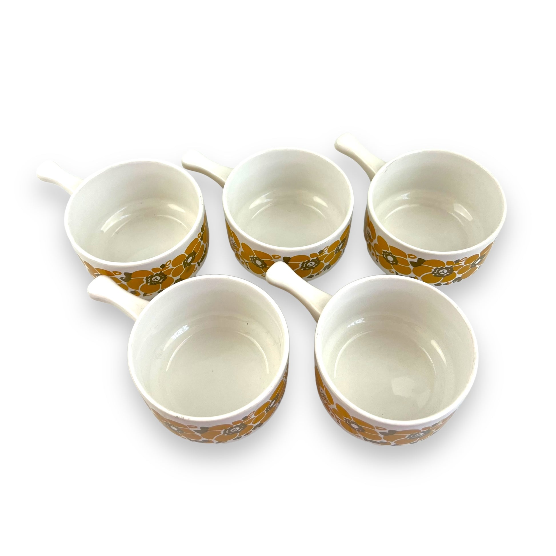 Crafted in Staffordshire, England, this set of 5 Yellow Flower Ramekins is perfect for entertaining. Its ovenproof design ensures versatility and durability. Please note, one handle has been reglued, as shown in the photo.