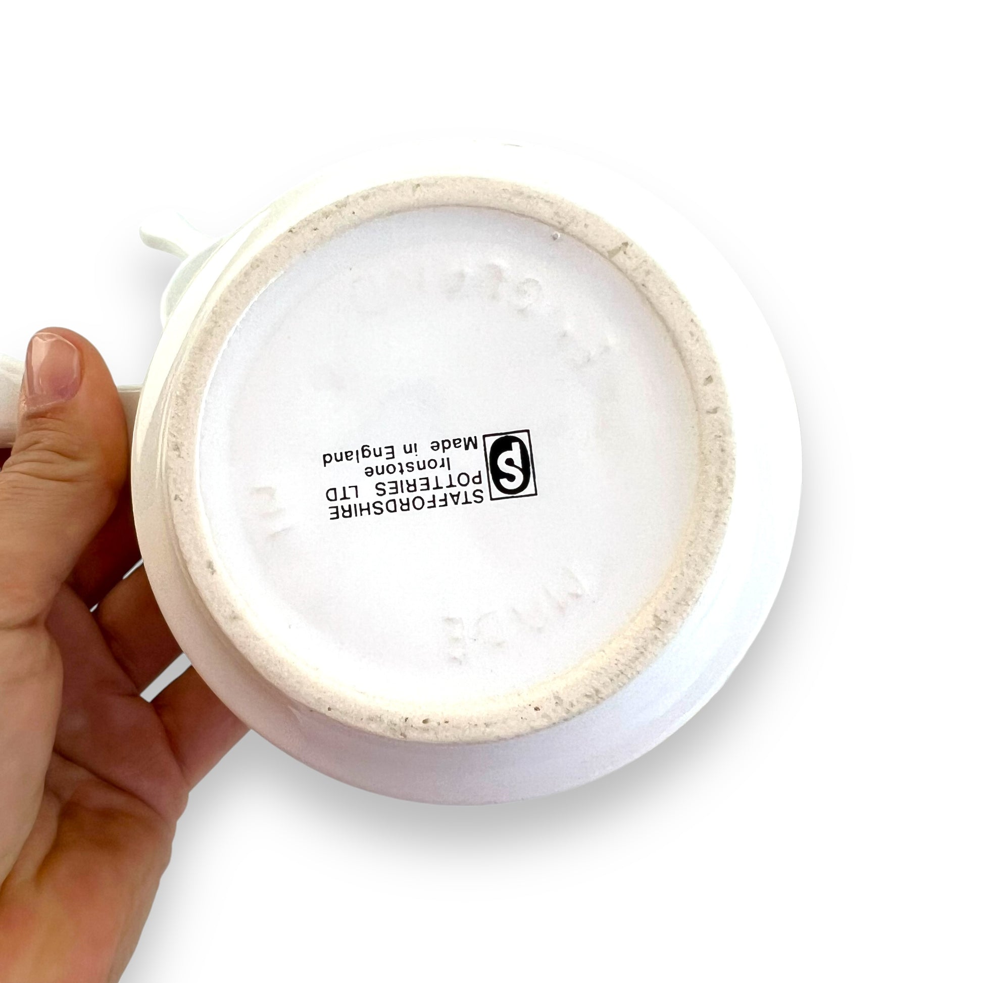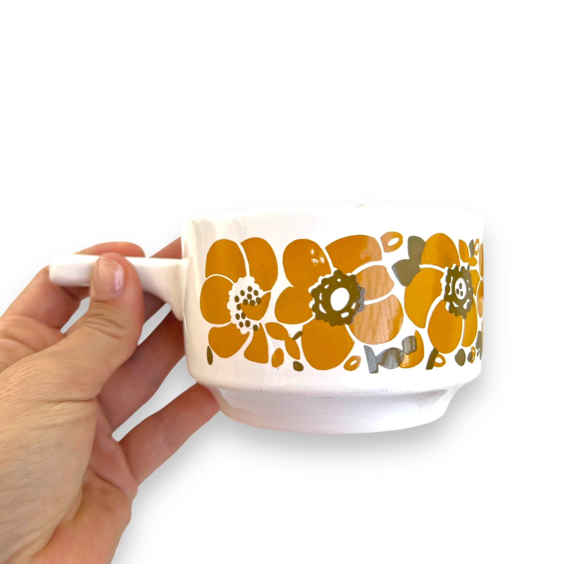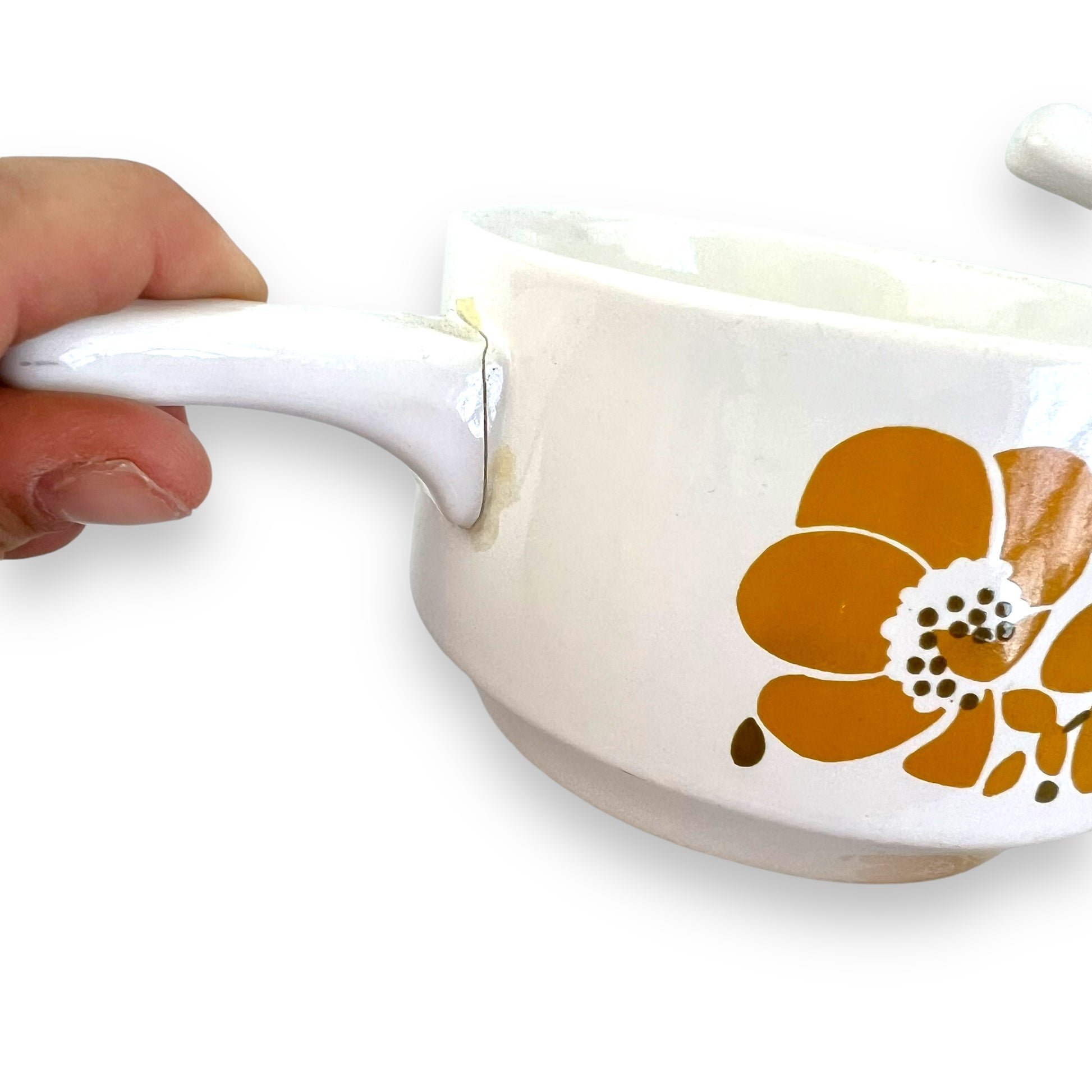 Crafted in Staffordshire, England, this set of 5 Yellow Flower Ramekins is perfect for entertaining. Its ovenproof design ensures versatility and durability. Please note, one handle has been reglued, as shown in the photo.