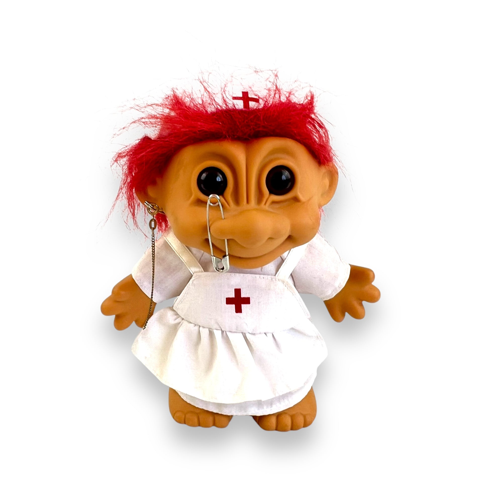 This Troll Doll, with its striking red hair, comes in a large size and is dressed in a white nurse outfit.