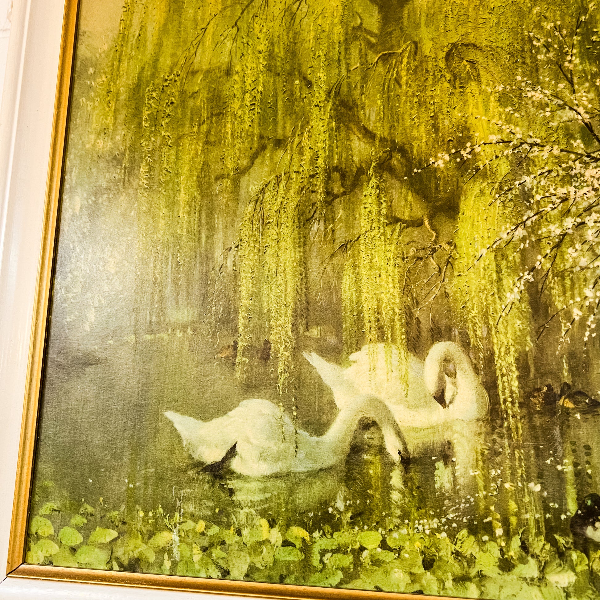 A serene framed print of the painting Lakeside in Spring by British artist Vernon Ward, depicting swans gliding peacefully across still water beneath soft, cascading willow trees. The gentle spring palette of greens and muted tones creates a calm, romantic atmosphere typical of Ward’s much-loved landscape scenes.