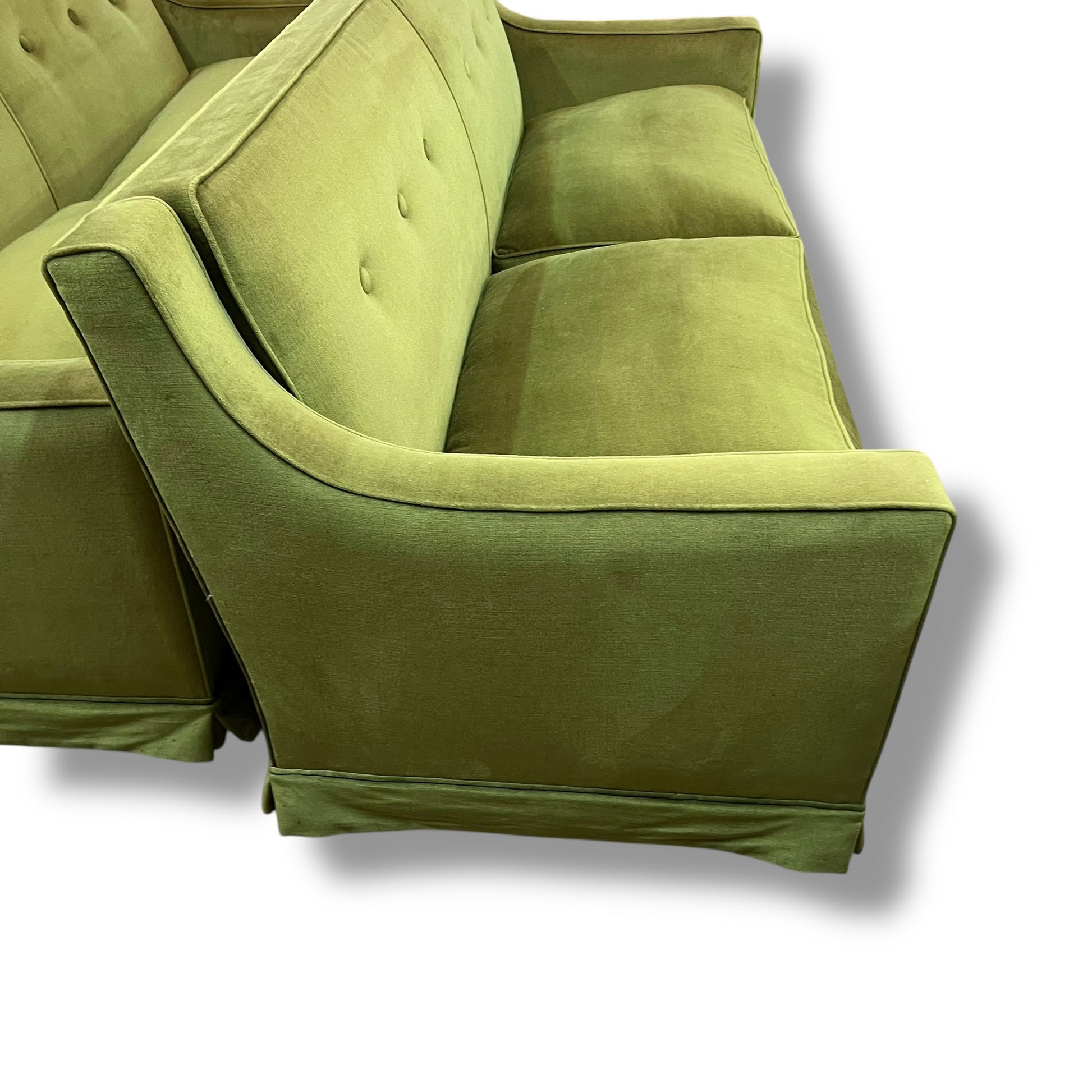 Reupholstered in the late 1970s in a luxurious moss green velvet fabric, this sofa was kept in the “good lounge room” its entire life — used sparingly and lovingly maintained. The upholstery remains in beautiful condition, showcasing the quality craftsmanship and tailored piping of the era.