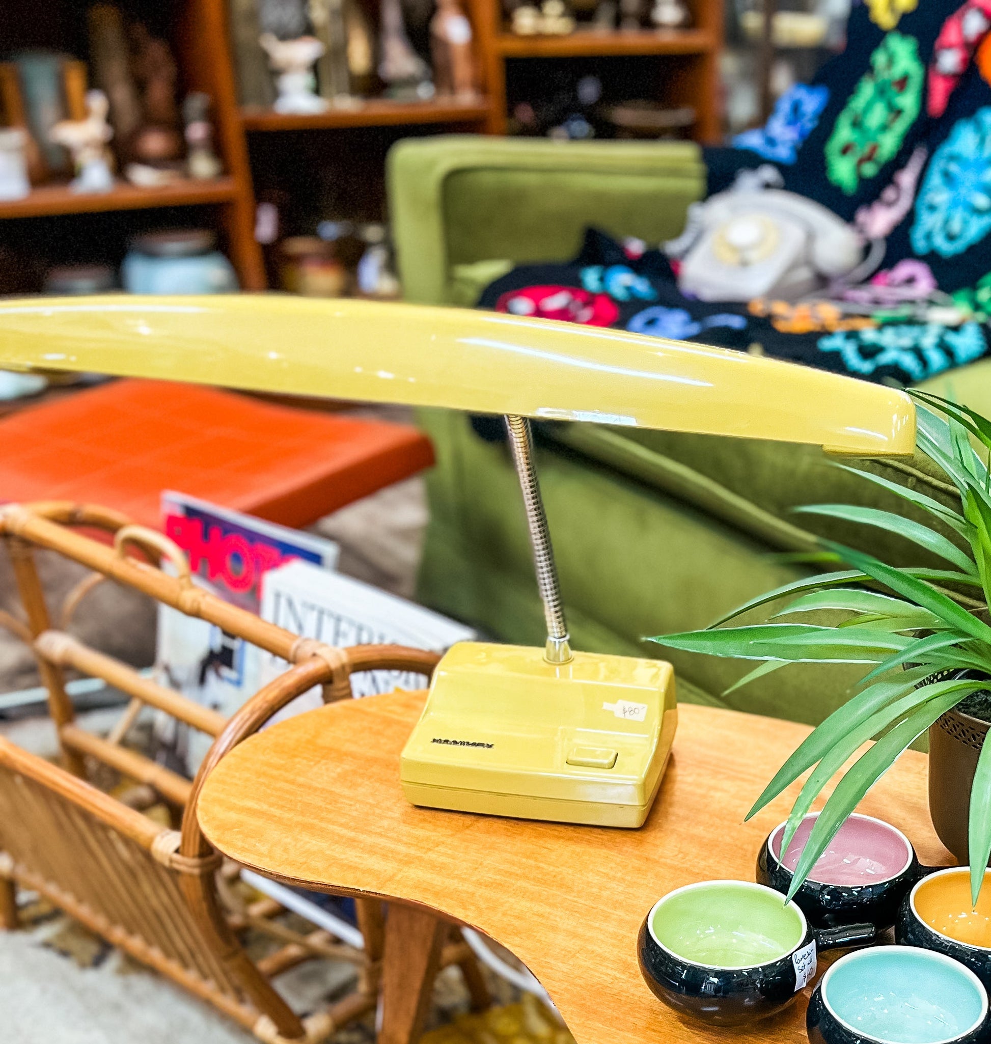 Brighten up your workspace with this retro Hanimex yellow office lamp, a sleek 1970s design that brings instant vintage charm. Featuring its iconic elongated shade, adjustable gooseneck, and classic butter-yellow colour, this piece is perfect for desks, side tables, craft rooms or reading nooks.